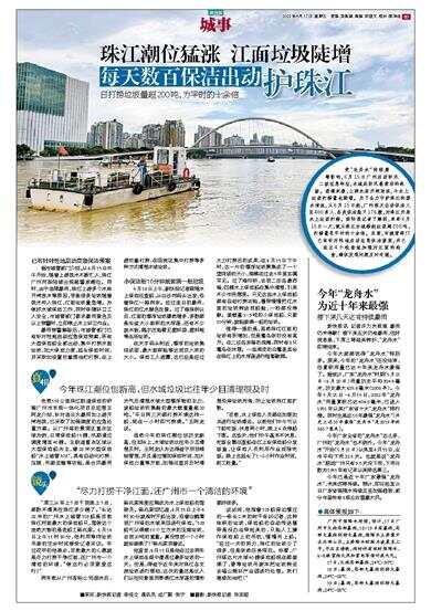 日打捞垃圾量超200吨,为平时的十余倍 受“龙舟水”持续袭粤影响,6月15日广州启动防汛二级应急响应,水域成防汛最前沿的战场。涨潮来袭,上游水库开闸泄洪,令水上垃圾打捞量也陡增。为了全力守