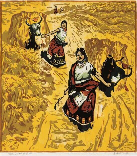 ■《初踏黄金路》 李焕民 54×49cm 版画 1963年 广东美术馆藏 |