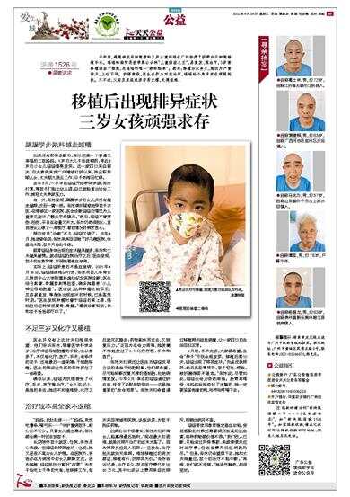 温暖1526号 ●温暖诉求 半年前,罹患神经母细胞瘤的三岁女童瑶瑶在广州接受了脐带血干细胞移植手术。瑶瑶的病情是医学界公认的“儿童癌症之王”,易复发、难治疗,3岁前移植造血干细胞,是