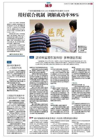 广东和谐医调委2020-2021年度医疗纠纷案件3349件 2020-2021年度广东和谐医调委累计立案调处(含遗留案件)医疗纠纷案件3349件;累计调解结案2942件,已结案件中成功调解2880件,调解成功率为98%;累计为患方争取合法赔偿金额约21298.7万元…… 新快报记者日前从广东和谐医调委(下称“医调委”)获悉,作为广东省医患纠纷化解的主要力量,广东和谐医调委运用市场机制在“三调解一保险”的制度框架内,通过“保、调、赔、防、管、法”的联合机制,成功化解了大量医疗纠纷。 同时发布的《广东省医疗纠纷案件蓝皮书(2020-2021年卷)》,对医疗风险防范中存在的问题提出针对性的建议,推动补足医疗机构在医疗质量管理中的短板。 ■采写:新快报记者 黎秋玲 【数据】 案件相对集中在二、三级医疗机构 2020-2021年度,全省立案调处的医疗纠纷案件中,三级医疗机构案件数占比约53%;二级医疗机构案件数占比约34%;一级医疗机构案件数占比约11%;其他(如私人诊所等)案件数占比约2%。 省医调委相关负责人表示,医疗资源及大型医疗机构分布集中的地区,纠纷案件发生数量也相对较多。 广州、惠州、佛山、清远等地区是目前全省中“调赔结合”机制对医疗机构覆盖率相对较高的地区,而梅州、深圳、江门则是“调赔结合”机制对医疗机构覆盖率相对较低的地区。 三级医疗机构案件中外科纠纷占了近四成 蓝皮书披露的数据显示,不同地区、不同科室产生纠纷既有共性也有特性。 其中,三级医疗机构案件数共计1765件,占比约53%;二级医疗机构案件数共计1147件,占比约34%;一级医疗机构案件数共计353件,占比约11%;其他如(私人诊所)共计84件,占比约2%。 鉴定案件中,三级医疗机构纠纷案件中一级科室分布情况如下:外科占比约39%;内科占约19%;妇产科占约15%;门急诊科占约8%;儿科占约4%;重症医学科占比约3%;肿瘤科占比约3%;护理科占比约2%;麻醉医学科占约2%;五官科占约1%;介入科占比约1%;精神心理科占比约1%;其他占比约2%。 二级医疗机构纠纷案件中一级科室分布情况如下:妇产科占比约30%;外科占比约27%;内科占14%;门急诊约9%,儿科约7%。一级医疗机构纠纷案件则是妇产科占比约27%;门急诊科占比约22%;外科占比约15%;内科占约13%;儿科占约7%;精神心理科占比约6%。 【探因】 这些科室易引发纠纷 多种原因引起 “从数据来看,外科、妇产科、内科、门急诊科、儿科这几个科室是医疗纠纷相对高发的科室,其中,外科、妇产科尤为突出。”医调委专家分析指出,各级医疗机构纠纷案件中,主要科室纠纷产生的原因,有检查不到位、诊断不到位、用药不规范、抢救不到位、知情告知不充分、操作不规范、病情评估不到位等。 病情评估不到位等原因易发纠纷 医源性因素为纠纷发生的重要因素。数据显示,病情评估不到位,几乎是所有科室纠纷发生的重要原因。 知情告知问题不容忽视,特别是产科、妇科、外科、内科,产科主要体现在没有及时把产妇的病情、胎儿宫内情况、医疗措施、分娩风险、孕期保健信息等告知产妇或其家属,或虽然已经履行了告知义务,但《知情同意书》上告知内容不全或者是没有让产妇及其家属签字等;妇科、外科主要体现在术前风险告知不到位、替代治疗方案告知不足等。 病历书写不规范、检查不到位在各等级医院机构的急诊科纠纷原因中均较为突出,病历书写不规范主要体现在对现病史、体格检查及处理、抢救措施等记录欠缺或者欠详细,患者病情变化过程记录欠缺或简单,未书写病历等。检查不到位主要体现在未能完善相关体格检查,对涉及病因复杂的患者未能完善相关辅助检查以进行鉴别诊断等,导致对患者的病情评估及判断不到位。 操作不规范问题在三级医疗机构及二级医疗机构妇科纠纷原因中较为突出,在三级医疗机构妇科的纠纷原因占比高达40%,在二级医疗机构妇产科的纠纷原因占比高达46.03%,主要体现在妇科手术过程中操作未尽高度谨慎注意义务,操作不到位导致损害发生。 外科: 手术治疗本身风险高,并发症多 对于外科来说,外科涵盖了普外科、骨科、泌尿外科等诸多科室,病种多,病情复杂,且外科以手术为主要的治疗手段,手术治疗本身风险高,并发症多,对医务人员的水平要求亦相对较高,而往往患方对手术效果的直观性较强,认为只要出现并发症或者是治疗效果不好就是手术做不好,故非常容易引起医疗纠纷。 妇产科: 产科繁杂,分娩是个多变的过程 产科工作繁杂,且分娩是个多变的过程,一些情况容易令人预料不及,而产妇分娩往往被社会乐观地看成是一个简单的生理过程,要求分娩中的母婴绝对安全,没有看到分娩这一过程所蕴含瞬息万变的生理和病理变化,对分娩的期望值过高,当出现产妇及新生儿损害时,往往不能接受,容易引起纠纷。 内科: 病种类别繁杂,疑难问题较多 由于其涉及的病种类别繁杂,疑难问题较多,患病率高,诊断多以物理检查或非介入性检查为主,诊断难度相对较大,容易出现漏诊、误诊,治疗方式多样复杂,见效慢等是内科产生纠纷的客观因素。 除了客观因素外,医务人员因查体不全面,过分依赖辅助检查结果,分析病情不充分,从而造成误诊、漏诊;治疗中,没有做到及时观察病情的变化,监测不及时,以致不能把握病情的转变及发展趋势,无法给予有效的治疗措施,用药失误等亦是内科纠纷产生的重要因素。 门急诊科: 患者来院治疗的