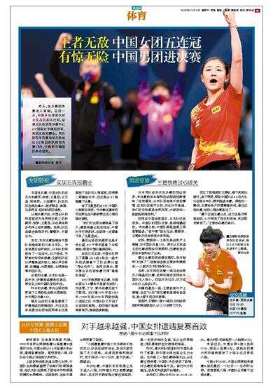 昨天,世乒赛团体赛进入高潮。在同一天,中国乒乓球男队和女队与日本队过招,结果女队在团体决赛中以3:0轻取对手捧起冠军,实现五连冠霸业。男队则在半决赛有惊无险地以3:2将日本队挡在决赛门外,今晚将与德国队争夺冠军。 ■新快报记者 高京 女团轻松 实现五连冠霸业 本届世乒赛,中国女队的成员为孙颖莎、陈梦、王曼昱、王艺迪、陈幸同。小组赛中,队伍先后击败加拿大、波多黎各、美国、马来西亚,轻松斩获四连胜。 从淘汰赛开始,中国女队的阵容固定为世界排名前三的孙颖莎、陈梦、王曼昱,仅在具体排兵布阵上有所调整。结果,队伍连续击败匈牙利、葡萄牙、中国台北。 其实,本次比赛能够给中国队制造威胁的只有日本队。与东京奥运会时相比,日本队的阵容有了一些变化,石川佳纯、平野美宇均没有参赛,全新的队伍以伊藤美诚为核心,辅以早田希娜、佐藤瞳、木原美悠、长崎美柚等年轻队员。 此前的比赛,日本队也是一盘未失,伊藤美诚赛前还表态,将会全力向中国队发起冲击。 昨日的决赛,率先出场的陈梦连下三局轻松击败木原美悠,为中国队先拿1分。 随后出战的王曼昱遭遇了伊藤美诚的顽强抵抗,不过这名东京奥运会团体冠军得主还是展现了良好的心理素质,即便第二局输给对手,但还是以3:1稳稳赢下比赛。 有了王曼昱的这1分,中国队心里踏实很多。作为解说嘉宾的邓亚萍也在不断称赞这名小将的稳定表现。 “我们对这场决赛准备了很久,赛前抱着必胜的信念,不管对手打得多好,这场球一定要拿下来。”王曼昱说。 最后出场的孙颖莎也是不负众望,3:0干净利落拿下长崎美柚,帮助中国队摘得冠军。 在自己的主场,中国女队捍卫了荣耀,以8战8胜且一盘未失的成绩拿下了队史第22座“考比伦杯”。有网友表示,看中国女乒的团体赛可谓“稳稳的幸福”。 2010年俄罗斯世乒赛,中国女团以1:3爆冷不敌新加坡队,刘诗雯、丁宁、郭炎在赛后流下了眼泪。如今继1975年至1989年、1993年至2008年两度创造八连冠之后,中国女队又开启了五连冠的旅程。期待她们能够再接再厉,继续延续辉煌。 男团惊险 王楚钦终过心理关 日本男队在本次世乒赛的想法很多,半决赛前张本智和的话颇具挑衅意味,“在我看来,日本队没有做不到的事情,这支队伍是可以的,无论对手是谁,我们的目标都是世界冠军,大家团结一致就能取得胜利。” 但想在中国击败国乒,日本队还差很多。中国队的团队优势,是很难撼动的。半决赛之前,中国队都是直落三局高歌猛进。“老中青”组合马龙、樊振东、王楚钦并没有受到太多考验。 此役,樊振东一上来先是击败户上隼辅,为中国队先拿1分。原本以为东道主的比赛进程会非常顺利,但赛前放话的张本智和站了出来。 看过比赛的球迷都在感叹,张本智和“打疯了”,他接连击败王楚钦和樊振东,一人就为日本队独得2分。 当然,这中间还夹着一场马龙击败及川瑞基的比赛,老将的稳定发挥给中国队注入信心。四组对决过后,双方在大比分上战成2平。 关键的最后一场,王楚钦面对户上隼辅,这名“00后”球员赛前显得有些紧张,脸上看不到任何表情。 首盘时,王楚钦一度4:9落后,但他在困难的时候连续追分,以12:10逆转了对手。 顶过了困难期的王楚钦,接下来势如破竹,连下两局,帮助中国队以3:2的大比分击败日本队,顺利挺进决赛。得胜的一瞬间,王楚钦张开双臂肆意庆祝,通过这场比赛,他的心理关算是过了。 “赢下这场比赛以后,自己还是非常激动的,心中背负了信念和使命,我证明我做到了。”王楚钦在赛后表示。 收视提醒 世乒赛·男团决赛 今日19:30 中国VS德国 CCTV5直播