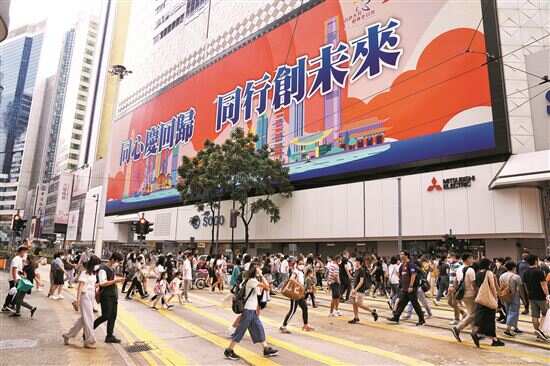 铜锣湾的巨幅大屏上打出“同心庆回归 同行创未来”的字样。 |