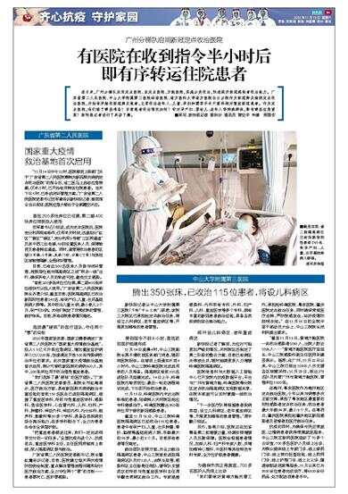 有医院在收到指令半小时后 即有序转运住院患者 连日来,广州分梯队启用定点医院、亚定点医院、方舱医院,实施分类收治,快速提升新冠感染者收治能力。广东省第二人民医院、中山大学附属第三医院岭南医