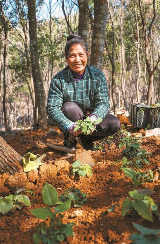 ◀村民在淫羊霍洛香林下中药材示范基地种植。 |