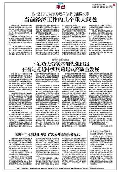 《求是》杂志发表习近平总书记重要文章 据新华社电 2月16日出版的第4期《求是》杂志将发表中共中央总书记、国家主席、中央军委主席习近平2022年12月15日在中央经济工作会议上重要讲话的一部分《当前经济工作的几个重大问题》。 文章强调,2023年经济工作千头万绪,需要从战略全局出发,抓主要矛盾,从改善社会心理预期、提振发展信心入手,抓住重大关键环节,纲举目张做好工作。 文章指出,要着力扩大国内需求。总需求不足是当前经济运行面临的突出矛盾。必须大力实施扩大内需战略,采取更加有力的措施,使社会再生产实现良性循环。要优化政策举措,充分发挥消费的基础作用和投资的关键作用。一是把恢复和扩大消费摆在优先位置。二是通过政府投资和政策激励有效带动全社会投资。要继续发挥出口对经济的支撑作用,加快建设贸易强国。 文章指出,要加快建设现代化产业体系。我们要练好内功、站稳脚跟。我国有世界最完整的产业体系和潜力最大的内需市场,要切实提升产业链供应链韧性和安全水平,抓紧补短板、锻长板。一是确保国民经济循环畅通。我国经济必须确保国家安全,确保基本民生,确保基础设施、基础产业总体正常运转。二是加快实现产业体系升级发展。要在重点领域提前布局,全面提升产业体系现代化水平,既巩固传统优势产业领先地位,又创造新的竞争优势。 文章指出,要切实落实“两个毫不动摇”。我们必须亮明态度、决不含糊,始终坚持社会主义市场经济改革方向,坚持“两个毫不动摇”。一是深化国资国企改革,提高国企核心竞争力。二是优化民营企业发展环境,促进民营经济发展壮大。 文章指出,要更大力度吸引和利用外资。纵观全球,发达国家和新兴经济体都把吸引和利用外资作为重大国策,招商引资国际竞争更加激烈。要推进高水平对外开放,依托我国超大规模市场优势,以国内大循环吸引全球资源要素,既要把优质存量外资留下来,还要把更多高质量外资吸引过来,提升贸易投资合作质量和水平。一是扩大市场准入。二是全面优化营商环境。三是有针对性做好外资企业服务工作。 文章指出,要有效防范化解重大经济金融风险。必须坚持标本兼治、远近结合,牢牢守住不发生系统性风险底线。一是防范房地产业引发系统性风险。二是防范化解金融风险。三是防范化解地方政府债务风险。 文章强调,2023年还有许多重要工作要做。要全面推进乡村振兴,坚决防止出现规模性返贫。谋划新一轮全面深化改革。推动共建“一带一路”高质量发展。深入实施区域重大战略和区域协调发展战略。推动经济社会发展绿色转型,建设美丽中国。