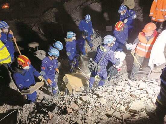 ■蓝天救援队队员扑下身子救援,身旁的土耳其救援队员紧张地关注着进展。 |
