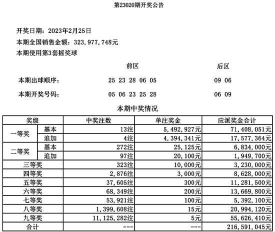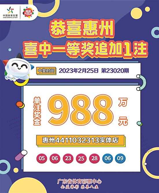 2月25日,体彩超级大乐透第23020期开奖,当期全国中出4注988万多元追加头奖、9注549万多元基本投注一等奖,当期广东中出1注追加头奖,落户惠州,中奖彩票是一张“7+3”追加复式票,单票奖金1001万多元。 ■新快报记者 陆妍思 全国井喷13注头奖 大乐透第23020期的中奖号码为:前区“05、06、23、25、28”;后区“06、09”。前区号码大小比、奇偶比均为3:2,“1”字头、“3”字头号码走空,“05”为上期重号,开出一组连号“05、06”;后区开出一小一大的偶奇组合,其中“06”为上期重号。 当期全国共开出13注一等奖。其中,4注为988万余元(含439万余元追加奖金)追加投注一等奖,分落河北沧州、广东惠州、广西玉林、陕西西安;9注为549万余元基本投注一等奖,分落河北沧州、内蒙古包头、江苏南京、浙江绍兴和温州、山东滨州、河南新乡、广西南宁、陕西西安。 惠州复式票中千万 据核查,惠州中出的追加投注一等奖出自秀丽路116号4411032313体彩实体店,投注金额189元,中奖彩票是一张“7+3”组合复式追加票,单票奖金1001万多元。 对比可见,由于采用了追加投注,本期河北沧州、广东惠州、广西玉林、陕西西安的幸运购彩者,在单注一等奖方面多拿了439万余元追加奖金,从而使得单注一等奖总奖金达到988万余元。 追加投注是大乐透独有的投注方式,在2元基本投注的基础上,多花1元进行追加投注,可多得80%的浮动奖奖金。 奖池滚存至6.48亿 同期二等奖开出272注,每注奖金2.51万余元;其中97注采用追加投注,每注多得奖金2.01万元。追加后,二等奖单注总奖金4.52万余元。 三等奖开出323注,单注奖金1万元。四等奖开出2876注,单注奖金3000元。五等奖开出37605注,单注奖金300元。六等奖开出68349注,单注奖金200元。七等奖开出53921注,单注奖金100元。八等奖开出1399608注,单注奖金15元。九等奖开出11125282注,单注奖金5元。 本期全国销量为3.23亿元,为国家筹集彩票公益金1.16亿元。奖池方面,本期开奖结束后,6.48亿元滚存至2月27日(周一)开奖的第23021期。
