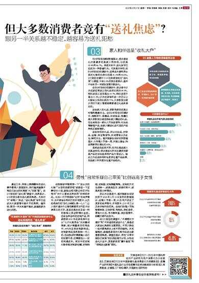 数据说,越年轻、跟另一半关系越不稳定,越容易为送礼犯愁 03 家人和伴侣是“收礼大户” 《分析报告》调研数据显示,受访者送礼对象最多的是家人和伴侣,分别是59.4%和46.7%。亲密关系中,送礼似乎已经成为一种普遍行为。尤其是对伴侣,在《分析报告》的调研中,经常送夫妻和男女朋友礼物的比例分别是41.4%和33.8%。DT财经也曾对1114位读者发起过“送礼观”小调查,只有8.9%的受访者表示,基本不会给另一半或拟发展对象送礼。 在《分析报告》的调研中,受访者中认为应该经常送父母礼品的比例为39.9%,相比送岳父岳母高出10.7%,相比送孩子高出11.9%;认为应该每年送一次及以上礼物给父母的比例为77%,大多数受访者认同对于家人情感是需要通过礼品来表达的。 送给家人的礼品,多数考虑的还是以吃喝和健康为主。在《分析报告》的调研中,烟酒茶叶、保健品、休闲食品、按摩仪是大多数受访者选择给家人赠送的礼品,但也有相当一部分人开始送首饰、化妆品等颜值产品,给家人赠送礼品可选的产品种类正逐渐增多。 送给伴侣的礼品,则以化妆品、护肤品,金银、珠宝等首饰,休闲零食以及红包、鲜花为主。据天猫新生活研究所数据显示,今年情人节前一周,天猫上黄金、饰品搜索同比增长约30%。 虽然送的品类不同,但无论是送家人还是送伴侣,受访者送礼时关注最多的都是产品的实际效果和产品外观设计。除此之外在送伴侣时会更多注重产品品牌,而送家人时则更为注重产品档次。 04 男性“日常怀疑自己审美”比例远高于女性 最近几年,网络上频频翻车的送礼事件看得人瑟瑟发抖,我们越来越摸不准自己送出的究竟是“礼”还是“雷”。在DT财经的“送礼观”调查中,结果显示,2/3的受访者为送礼感到焦虑。尤其对于“有情人”来说,“送礼焦虑”似乎已经成为大家爱情中绕不开的黑洞。越年轻、跟另一半关系越不稳定,就越容易为送礼犯愁。 在购物软件随便搜一下“送女友的礼物”“女孩收到都哭啦”或者逛一下豆瓣劝分小组,就能出现无数让你忍不住想问“为什么要有这种东西”的神奇存在。比如一打开便面临“社死”的有声情书、关不掉音乐和闪灯的手写贺卡,以及忽然流行的“抄《上林赋》,得一心人”,让人想不通为什么情侣需要用古代臣子劝谏君王的文字,甚至还是抄在圣旨一样的卷轴上来证明情比金坚。还有各种各样的定制产品,网易数读2021年在某电商平台以“七夕礼物男生”为关键词搜索,统计销量前百的商品中,43%为各类定制款商品。定制款商品虽然是独一无二的,但在购买时需要融入自己的创意巧思,还需要投入一定的沟通成本。现实中的定制礼物多是定制易拉罐、定制相框、定制画、定制牌匾等等。定制的方式也很单一,或是刻名字,或是印照片,或是来段土味情话。 别以为这是段子,据天猫新生活研究所于2023年2月13日发布的数据显示,在情人节前一周,95后用户买走了更多的有声情书、手写贺卡、DIY手工以及亲手制作的花束。在他们的情人节购物清单里,立体拼图、泡泡机、彩虹曲奇、零食大礼包、考古趣味盒、流沙画摆件、纸雕灯都列在其中。 在DT财经的调查中,“不清楚对方喜好”和“不知道到底该送什么”,是造成大家送礼焦虑的主要原因。不同人群在一些次要焦虑点上有不同的偏向。关系越稳定,就越容易因为礼物无法送出新意感到焦虑。调查还显示,男性“日常怀疑自己审美”的比例远高于女性,女性在送礼大业中,更容易受到“囊中羞涩”和“很难送出新意”困扰。 数据来源 艾媒咨询《2021-2022年中国礼物经济产业研究与用户消费行为分析报告》、艾媒咨询《2023年中国新春礼盒消费者行为洞察报告》、前瞻产业研究院《中国礼品行业市场前瞻与投资战略规划分析报告》、网易数读、企查猫、DT财经调研、天猫新生活研究所