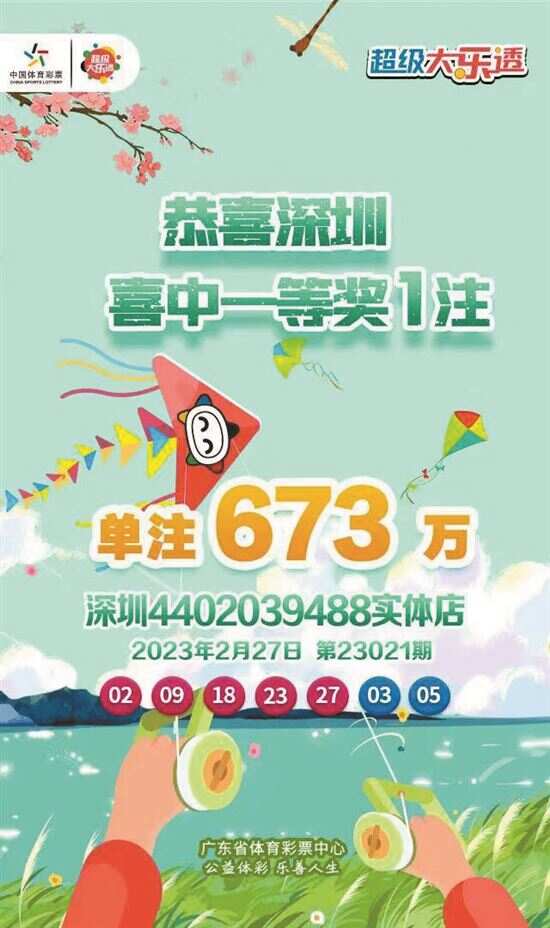 新快报讯 记者陆妍思报道 2月27日,体彩超级大乐透第23021期开奖,全国中出2注1212万余元追加一等奖及3注673万余元基本一等奖,其中广东中出1注基本一等奖落户深圳,中奖彩票是一张“6+4”组合复式票,单票奖金692万元。 全国中出5注一等奖 大乐透第23021期的中奖号码:前区“02、09、18、23、27”;后区“03、05”。本期全国中出5注一等奖。其中,2注1212万余元(含539万余元追加奖金)追加投注一等奖,花落福建厦门和贵州遵义;3注673万余元基本投注一等奖,花落广东深圳、贵州黔西南和云南曲靖。 深圳中出的基本投注一等奖出自白花社区洞富民广场1栋105商铺4402039488体彩实体店,投注金额72元,中奖彩票是一张“6+4”组合复式票,单票奖金692万元。 对比可见,由于没有采用追加投注,本期来自深圳的购彩者,在单注一等奖方面少拿了539万余元追加奖金,从而错失中出1212万余元追加头奖的机会。 追加投注是大乐透独有的投注方式,在2元基本投注的基础上,多花1元进行追加投注,可多得80%的浮动奖奖金。 奖池滚存至6.48亿 同期二等奖开出264注,每注奖金3.8万余元;其中84注采用追加投注,每注多得奖金3.04万余元。追加后,二等奖单注总奖金6.85万余元。 三等奖开出649注,单注奖金1万元。四等奖开出1060注,单注奖金3000元。五等奖开出33904注,单注奖金300元。六等奖开出27061注,单注奖金200元。七等奖开出77872注,单注奖金100元。八等奖开出963998注,单注奖金15元。九等奖开出8865482注,单注奖金5元。 本期全国销量为3.04亿元,为国家筹集彩票公益金1.09亿元。奖池方面,本期开奖结束后,6.48亿元滚存至3月1日(周三)开奖的第23022期。