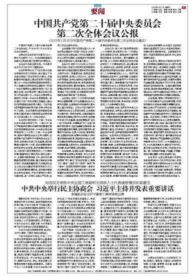 (2023年2月28日中国共产党第二十届中央委员会第二次全体会议通过) 中国共产党第二十届中央委员会第二次全体会议,于2023年2月26日至28日在北京举行。 出席这次全会的有中央委