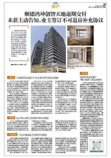 顺德鸿坤创智天地逾期交付 未获主动告知,业主签订不可退房补充协议