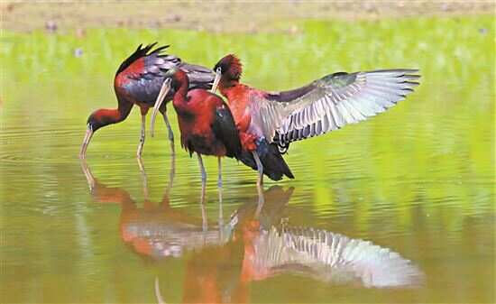 新快报讯 记者黎秋玲 通讯员林荫报道 近日,有摄影爱好者在东莞谢岗镇黎村村一稻田新发现5只彩鹮——一度被认为在中国绝迹的珍稀鸟类。这是东莞首次野外监测到国家一级保护野生动物彩鹮,是东莞鸟类新纪录。 鸟类摄影爱好者蔡汝广是发现彩鹮的“第一人”。4月15日上午,他来到谢岗镇黎村松岗头拍摄黑翅长脚鹬,突然发现远处有几只黑色的大鸟,形态像鹭鸟那样大,于是他赶紧把它们拍下来了。通过查阅资料,发现是国家一级保护野生动物彩鹮。 彩鹮属于鸟纲、鹈形目、鹮科、彩鹮属的鸟类,其体形修长,羽毛栗紫色,鸟喙似弯刀,羽色会随着光照角度而改变,由此得名“彩鹮”。彩鹮主要栖息在温暖的河湖及沼泽附近,有时也会到稻田中活动,性喜群居,主要以水生昆虫、昆虫幼虫、虾、甲壳类、软体动物等小型无脊椎动物为食。 据悉,这次在谢岗镇黎村新发现的彩鹮属于旅鸟,在迁徙途中经过谢岗,由于黎村稻田的食物和环境适合它们的生活,因此停留在黎村稻田,待补充体力后将再次迁徙。