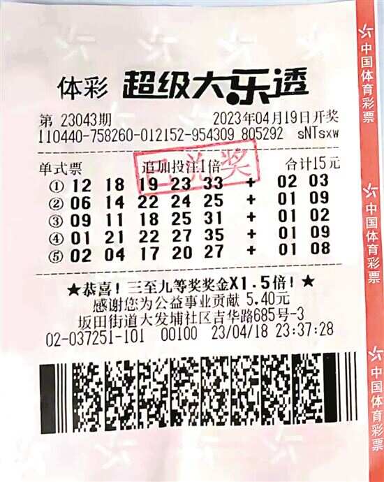 体彩大乐透第23043期,深圳斩获一注一等奖 新快报讯 记者陆妍思 通讯员深圳体彩报道 “我差一点就把彩票扔了……”4月21日,深圳体彩大乐透第23043期一等奖得主李先生(化姓)与妻子一起现身领取2299万元大奖,并贡献税收近460万元。兑奖时,李先生表示,他差点因为粗心,把中奖票扔进了垃圾桶。 追加投注,机选票擒获2299万 4月19日,体彩超级大乐透迎来“10亿元大派奖”的第五期即第23043期开奖,摇出中奖号码为:前区“02、04、17、20、27”,后区“01、08”。本期全国共中出4注一等奖。其中3注符合本次派奖参与条件,分享了本期1500万元一等奖派奖奖金,分享派奖奖金后单注总奖金为2299万余元(含800万元追加奖金+499万余元派奖奖金),广东中出其中1注,落户深圳,中奖彩票是一张5注15元的单式追加票,由坂田街道大发埔社区吉华路685号-3的4402037251体彩实体店售出。 中奖者李先生表示,自己平时购彩都是机选,大多是路过体彩店的时候顺便买几注。他说,“我平时只是偶尔买买彩票,每次就机选买个5注,小小娱乐一下,这次买的号码也是机选的。当时,老板问我要不要追加,说有派奖活动,我就按照老板说的买了,没想到中了一等奖,真的非常感谢老板详细的介绍和热情的服务!” 看错期号,差点扔掉中奖票 4月20日早上,李先生用手机搜索开奖号码,他大致扫了一眼,发现好像没有中奖,正准备把彩票扔到垃圾桶,突然看到彩票上面的期号和网上显示的期号不一样,李先生重新检查了一下,发现网上的开奖号码不是最新一期的,于是他立即关注了深圳体彩微信号,点开里面的“开奖公告”重新核对,当看到第五注号码的时候,李先生发现票面的号码和中奖号码一模一样,他说当时以为自己眼花了,“我完全不敢相信,虽然平时买得少,不太懂中奖规则,但还是知道如果全中了,肯定就是中了一等奖嘛!”于是,他第一时间打电话给妻子。“我接到电话的时候,还以为他在逗我玩。”李先生的妻子笑着说,“他说中了一等奖,不太敢相信,让我也好好看一下,我心想,哪有这么巧的事情,但还是对着他发的照片,认真核对了几次,这才相信是真的中了。” 当说到差点失去这注大奖,李先生反思道,“我差点因为马虎失去了大奖,我现在下载了中国体育彩票的APP,关注了深圳体彩微信号,以后看开奖号码只看官方的。” 孝顺夫妻,让父母过得好一点 在谈到如何规划这笔奖金的时候,李先生和妻子几乎同时脱口而出:“让父母过得好一点!”李先生的妻子说,“我们父母都还在工作,我们看着都挺心疼的,现在可以让父母过上更好的生活了,可以让他们安心地享受天伦之乐。” 李先生的这注大奖是今年大乐透10亿元大派奖以来,深圳中出的首注超值大奖,为深圳购彩者开启了好运,带来了惊喜。大乐透10亿元大派奖仍在火热进行中,所有奖级都派奖,奖金最高可翻番,进行追加投注且单期单张购彩金额15元及以上即可参与,这场爱心与幸运共享的欢乐盛宴,期待你的加入!
