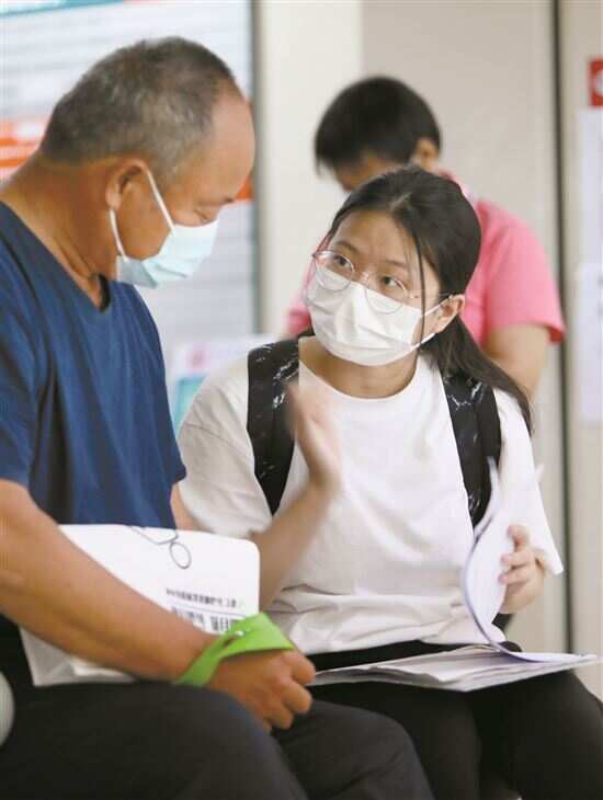■小庄坐在诊室外给刘伯讲解就诊流程。 |