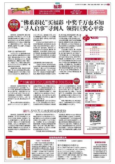 新快报讯 记者陆妍思 通讯员陈家博报道 “买了好几年的彩票,头一次中这么大的奖,很幸运,也很高兴!”近日,在潮州福彩中心,喜中第23047期双色球一等奖510万元的潮州彩民现身领奖。当天上午,潮