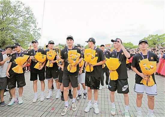 广东工业大学篮球队在CUBAL总决赛中击败清华大学摘得全国总冠军 19日中午,在中国大学生篮球男子一级联赛(CUBAL)总决赛中击败清华大学并摘得全国总冠军的广东工业大学篮球队载誉归来。在机场、在校园,学生们簇拥着队伍,大家呐喊着、拥抱着,笑声和掌声响彻云霄,化作美丽的模样。那场景,正如一位同学手中的条幅写的那样:“青春,在复兴征程上闪闪发光。” 5万多份“冠军鸡腿” 全校师生分享快乐 中午时分的白云机场T2到达大厅,数十名身穿广工校服的学生拿着鲜花,举着标语,齐齐整整地站在那里。一位手上拿着“以奋斗致敬奋斗”的黄同学告诉记者,看到球队逆转获胜,宿舍的同学兴奋得几乎一夜没睡,今天一大早他们就来到机场迎接球队,希望能够早点见到球员们。 当广工男篮从门口走出的那一刻,“全国总冠军,粤狮展雄风”的呐喊声响彻机场到达大厅。获得总决赛MVP的陈国豪单手举起金杯,现场更是一片沸腾。 与学生们一起,广东工业大学的领导也在机场迎接队伍归来。校长邱学青表示:“通过比赛,我看到了广工拼搏和永不言弃的精神,这代表了广东学子和中国大学生的精神风貌。年轻人碰到困难的时候敢于去面对和克服,不放弃。这不仅仅是比赛的胜利,更是一种年轻人精神的展现,我们要去弘扬和学习,体育就具有这种传递精神的力量。” 这次夺冠,广工篮球队收获了来自省教育厅30万元的奖金。同样,学校特意准备了5万多份鸡腿送给全校师生,希望每一个人都能享受喷香的“冠军鸡腿”,一同分享夺冠的快乐。 “鸡腿我一定会吃的,必须要吃。”广东工业大学党委书记胡钦太笑着说。 从机场到校园呐喊不断 “我们把奖杯带回来了” 机场简短的欢迎仪式过后,全队乘坐大巴向广东工业大学大学城校区驶去。此时,全校数千名学生早已挤在正门,他们举着手机,翘首企盼着。 当球队抵达之时,现场的气氛更是被瞬间点燃。“广工,冠军!”学生们在烈日下踮着脚,仰着头,兴奋地喊着。 陈国豪的一句:“同学们你们好,我们把奖杯带回来了。”现场再度爆发出雷鸣般的掌声,“MVP”的喊声响彻云霄。 在同学们的簇拥下,全队来到会议室与媒体记者面对面。面对“长枪短炮”, 广东工业大学体育学院院长龚建林娓娓道来。 “对比征战总决赛的两队,在招生方面广工与清华大学相比处于劣势,广工基本上是在广东招生,而清华大学则是全国招生。同样,清华大学也有广东的生源。在这方面,双方是有差距的。我在比赛场地的电梯里碰到清华大学的几位球员,他们都是用粤语在交流。”龚建林说。 在龚建林看来,球队在极为困难的情况下展现出团结协作、顽强拼搏的精神,这与球员们日常刻苦的训练是分不开的。同样,广东篮球良好的氛围也滋养了队伍,日常的各项大赛,更是为球员们积累了宝贵经验。 【揭秘】 广工男篮训练多苦? 体能教练透露,早操每周六练 在圈子里,广工男篮被称为“田径队”,意思就是球队在日常的体能训练中极为刻苦。正是每天挥洒下的汗水,成就了今日金牌之荣光。 作为球队的队医兼体能教练,欧威在接受记者采访时表示,篮球队的选手都要出早操,刚开始是一周五练,后来慢慢到一周六练。 “早操基本上是一天田径场一天力量房,时间在1个多小时,因为他们在训练后还要回去上课,”欧威表示,“在短暂的时间内,训练量是非常大的,球员有时甚至会因为太累而呕吐。但球员来到训练场后,就要全身心投入进来。” 虽然训练量很大,但球员们都努力完成教练员的要求,如果上午没课,他们在早操结束后还要加练投篮。下午或晚上的技战术训练,他们也不会缺席。 与此同时,欧威在体能训练中还会加入一些三人篮球的训练方法。因为三人篮球比赛更强调身体对抗,这会帮助队员更好去适应比赛。 正是日积月累的刻苦训练,为球队打下了良好的基础,也铸就了南粤雄狮坚韧不拔、永不放弃的拼搏精神。 【人物】 ●球队核心陈国豪 将踏上CBA赛场 已做好心理准备 去年决赛惜败给清华大学,因5次犯规提前离场的陈国豪非常遗憾,但仅仅一年过后,他就率队完成“复仇”,用一座冠军奖杯为自己的大学篮球生涯画上句号。 这名来自揭阳的小伙总是那么腼腆,平时的话非常少。在夺冠的那一刹那,2.01米的球员喜极而泣。 “确实积攒很久了,是一种压力的释放,眼泪控制不住了。整个大学篮球生涯,过程是有遗憾的,但结局算是很完美。” 接下来,陈国豪将参加今年的CBA选秀,外界预测他很有可能以“状元秀”的身份被宁波男篮选中。对于转战职业赛场,他也做好了准备。 “到达CBA这个平台,心理准备是要做好的,至于达到什么样的高度,还是要看后面的努力。”陈国豪说。 ●主帅于广龙 我们没有思想包袱 告诉球员就是拼 作为广工男篮的主帅,于广龙昨天是外界追逐的焦点。无论在哪个场合,他都被人团团围住,签名合影就没断过。 “感谢全校的支持,你们是全队的最大动力。能够在决赛落后9分的情况下逆转清华大学,体现了全队的意志力和团结。其实赛前我们心态都很轻松,我告诉队员们就是拼,没有任何思想包袱。”于广龙说。 当晚夺冠之后,队员们兴奋地把于广龙抛向空中,这位腼腆的主帅告诉记者,球员们说他有点重。 接下来,广工男篮将迎来宝贵的休息时间,于广龙自己也将作为队员参加广东省男篮联赛。据他透露,接下来广工男篮