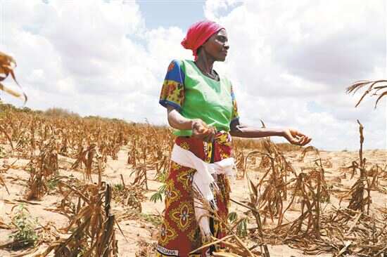 ■2022年3月23日,没有收获的村民扎瓦迪沮丧地站在肯尼亚基利菲枯萎的玉米地里。由于缺乏牧场和水,基利菲郡已经失去了大约9500头牲畜,21.9万人面临严重饥饿。 新华社发 |