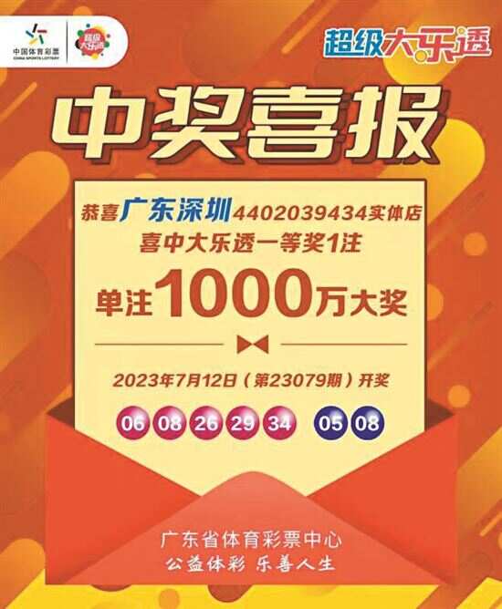 新快报讯 记者陆妍思报道 7月12日,体彩超级大乐透第23079期开奖,当期全国开出5注1000万元头奖,广东摘得其一花落深圳。 大乐透第23079期的中奖号码为:前区“06、08、26、29、34”;后区“05、08”。本期全国共开出5注一等奖,均为基本投注一等奖,单注奖金为1000万元,花落广东深圳、河北邯郸和石家庄、江西南昌、新疆乌鲁木齐。 本期深圳中出的1000万元基本投注一等奖出自深圳龙岗区华龙路8-5号铺(喜洋洋便利店)的4402039434体彩实体店,中奖彩票为一张10注号码、20元投入的单式票。 由于未采用追加投注,本期五位幸运购彩者在单注一等奖方面均少拿了800万元追加奖金,从而无缘单注1800万元封顶追加投注一等奖。追加投注是大乐透独有的投注方式,在2元基本投注的基础上,多花1元进行追加投注,可多得80%的浮动奖奖金。 同期二等奖开出72注,每注奖金18.03万余元;其中35注采用追加投注,每注多得奖金14.42万余元。追加后,二等奖单注总奖金32.46万余元。 三等奖开出133注,单注奖金1万元。四等奖开出943注,单注奖金3000元。五等奖开出13501注,单注奖金300元。六等奖开出28086注,单注奖金200元。七等奖开出25259注,单注奖金100元。八等奖开出711350注,单注奖金15元。九等奖开出7393826注,单注奖金5元。 本期全国销量为2.97亿元,为国家筹集彩票公益金1.07亿元。奖池方面,本期开奖结束后,8.60亿元滚存至7月15日(周六)开奖的第23080期。