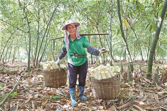 ■在清远英德市西牛镇小湾村麻竹笋种植基地里,刘大姐将两担麻竹笋挑出竹林。 |