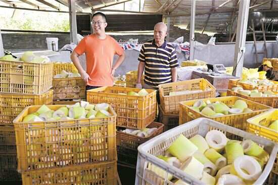 清远英德市积极打造麻竹笋百亿产业 刚进入采收时节,麻竹笋鲜笋行情看涨,农户忙碌于竹林间抓紧采收;收购点敞开大门迎接满载鲜笋的货车;厂房深处,麻竹笋深加工设备也正“虚位以待”……今年麻竹笋行情的“开门红”,为清远英德市打造西牛麻竹笋百亿产业增添动力。 英德市农业农村局局长周兰标跟新快报记者介绍道,近年来,英德市通过扩大规模打基础、延伸链条提效益、政企联动助丰收等方式积极发展西牛麻竹笋产业,初步实现种植面积、产量、从业人员、竹笋收购价、经营主体数量、发展效益等“六增”。接下来,英德市将坚持用工业化、系统化、法治化思维打造西牛麻竹笋百亿产业,通过引进和培育各类农业经营主体,不断推动麻竹笋产业种植、加工、销售等环节发展,依托“笋+鱼”“笋+清远鸡”预制菜产业等延伸麻竹笋产业链条,打造西牛麻竹笋品牌,提升麻竹笋发展效益,实现产销两旺。 鲜笋行情涨 众多农户采收忙不停 “5月底就开始来这儿砍笋了,我们的工钱按斤算,这段时间来,最多的一天砍了1000多斤笋。”上午9点多,在西牛镇小湾村麻竹笋种植基地里忙碌的刘大姐已是满头大汗。 说话间,刘大姐也没停下手上的活,只见她一手执刀利落砍向地上的麻竹笋,用另一只手托起笋子熟练剥去麻竹笋外壳,而后放入脚边的竹担,上肩一把挑起,便将两担笋挑到不远的水泥路边。连片竹林看不见边、瞧不清人,却能清晰感知到其间充满了热闹气息。 这30亩麻竹笋林并非刘大姐家的地,砍收麻竹笋的季节,她和老伴总穿梭在这样的竹林里,“近年砍收麻竹笋的工作,基本每人每天能收入两三百元,多数村民都乐意干。”英德市农业农村局相关工作人员向新快报记者介绍道。 西牛镇农办副主任陈晓龙表示,作为英德市麻竹笋产业园的核心区,西牛全镇有约5700户2万多人从事麻竹笋行业,仅种植面积便达到20.8万亩。 新快报记者了解到,近两年,西牛镇聚焦麻竹笋扩面提质,依托赤米村麻竹笋种植试验基地等地块探索标准化种植,西牛麻竹笋的种植面积也扩大了近万亩。 今年以来,英德市还通过义务植竹等活动为引领,带动全市“见缝插竹”,扩大麻竹笋种植规模。新快报记者了解到,英德市除了利用闲置山林、低效园地、疏林地、灌木林地、松材线虫病疫区等低效林地,推进退桉种竹外,还在西牛、连江口、九龙镇等高速路口旁、景区国道旁合理布局麻竹笋种植,打造具有“竹”韵味的景观休闲碧道。目前,英德全市麻竹笋种植面积达到80.81万亩,共有7.5万种植农户,带动从业人员达到8.8万人,年产量预计超120万吨,产值预计61亿元。其中,2023年以来新增种植面积15.01万亩,新增种植农户6500人,带动新增就业8200人,年产量预计增加14%,年产值预计增加51%。 发力深加工 延伸麻竹笋产业链 “麻竹笋全身是宝,鲜笋可食用,笋叶可以包粽子,枝干可以做竹制品……”在翠绿葱茏的竹林下,陈晓龙从上到下细数麻竹笋的用处。新快报记者了解到,除传统的鲜笋收购外,西牛镇内拥有11家麻竹笋企业,59个竹笋专业合作社及200多个家庭农场及加工点,麻竹笋加工在当地基础较为深厚。 英德市西牛镇立信农产品专业合作社老板刘冠然从事麻竹笋行业多年,目前在西牛开设了两个麻竹笋收购点,近来正抓紧收购,简单砍切过的鲜笋离开竹林便来到这儿,一筐筐铺满了收购厂房。空气里弥漫淡淡的鲜笋发酵气息,刘冠然提到,收到鲜笋后他们便着手进行切割、浸泡等初步加工。就在堆起的鲜笋“小山”旁,四五个妇女分工合作,将清洗过的麻竹笋送上切割台,在机器鸣响中笋片们也陆续登场。 “我们每年的鲜笋收购量在1000吨左右,除了自己加工使用,还销往四川、重庆等地的加工厂。”刘冠然提到,得益于近两年西牛麻竹笋知名度的提高,市场行情高涨,他们也从今年开始布局麻竹笋深加工链条,厂房的另一边正在抓紧安装生产线。 同样是在西牛镇,英德市大粤北食品公司也在更新麻竹笋全自动加工设备。该公司负责人钟子健提到,眼下正是麻竹笋砍收旺季,村民们多忙碌于采鲜笋,“我们现在有20个岗位需求,目前有8人在厂里上班,有社保也包食宿。”他跟新快报记者提到,目前,他们正向深加工方向发力。 眼下,该公司已经研发出冷吃螺蛳粉等5款麻竹笋即食休闲产品,“主要是在线上销售,我们目前与5家电商平台合作,每天能卖出两三万单。”钟子健说,这也激励他们加紧引入全自动化的麻竹笋深加工设备,提高生产效率。新快报记者了解到,英德市以麻竹笋省级现代农业产业园及镇域产业园平台创建作为抓手,重点扶持精深加工产业项目发展,鼓励企业积极引进新设备、研发新产品、做精深加工,以延伸麻竹笋产业链条提升发展效益。 新快报记者从英德市农业农村局了解到,随着今年华笋、大粤北等企业新增生产线,预计麻竹笋精深加工年产值可达到15亿元,即食笋产值可增长到11亿元。值得一提的是,英德市也正在积极开展“以竹代木”“以竹代塑”的推广应用,并与京东物流平台、粤港澳融媒中心洽谈,计划在京东官方平台设立“英德乡土”助农馆,拓宽麻竹笋销售渠道。 聚政企之力 推动西牛麻竹笋走出去 “可以说,目前业内对麻竹笋的开发利用刚达到10%,还有90%的空间等待开发。”在英德市麻竹笋产业协会,该协会副会长黎忠大胆判断。他提到,眼下,英德市的麻竹笋主要销往川渝、柳