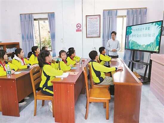 ■驻茂名市电白区麻岗镇工作队队员、大学生志愿者叶彬鸿给学生们讲解流感预防小知识。 |