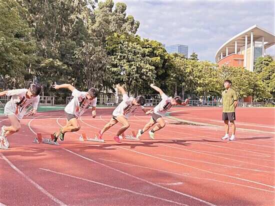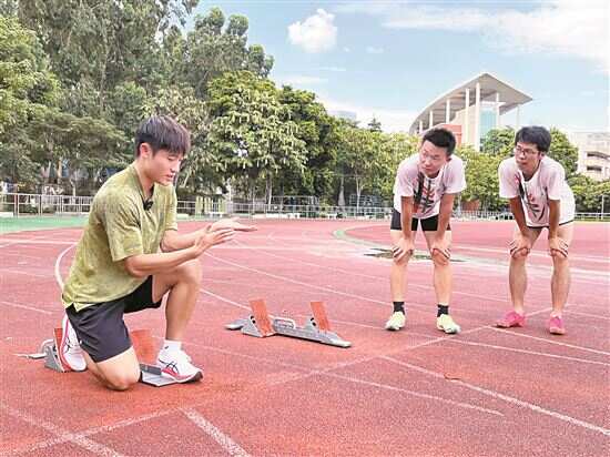 ■邓信锐为省实田径队队员们讲解起跑技巧。 |
