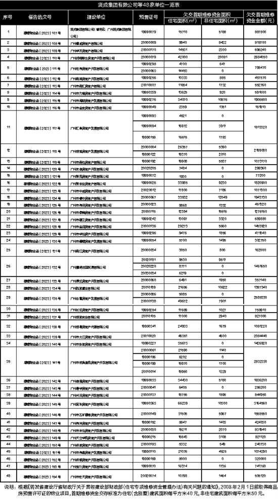 贤成集团有限公司等48家单位: 经我局核查,贤成集团有限公司等48家单位(详见附件)违反了《广东省物业管理条例》(1998年)第三十二条及《转发省建设厅省财政厅关于贯彻建设部财政部〈住宅专项维修资金管理办法〉有关问题的通知》(穗国房字〔2008〕557号)第一条等有关规定,未将其开发建设的物业项目首期维修资金交存至广州市房屋安全管理所开立的维修资金专户。我局已向贤成集团有限公司等48家单位发出《行政决定书》,责令限期交存首期维修资金,《行政决定书》送达后30日内,贤成集团有限公司等48家单位逾期未履行《行政决定书》的义务。 根据《广东省物业管理条例》(1998年)第四十一条规定,我局依法向贤成集团有限公司等48家单位作出《催告函》,因通过直接送达、邮寄送达(EMS)等方式均无法送达,根据《中华人民共和国民事诉讼法》第九十五条规定,现予以公告送达,自本公告发出之日起,经过30日即视为送达。请贤成集团有限公司等48家单位自本公告送达之日起10日内,到广州市物业专项维修资金管理中心(地址:广州市越秀区中山四路246号信德商务大厦4楼,联系电话:83636625)办理首期维修资金交存手续。 如对履行该义务有陈述、申辩意见,请在该期限内向本机关提出。如无正当理由,逾期仍不履行该义务的,本机关将依法申请人民法院强制执行。 特此公告。 附件:贤成集团有限公司等48家单位一览表 广州市住房和城乡建设局 2023年7月29日