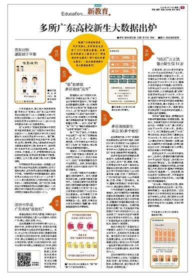 随着广东高校陆续举行开学典礼,多所高校也发布了2023级新生数据。各高校录取新生人数是多少?哪些省份的生源多?哪个姓氏的新生最多?一起来看看萌新们的大数据画像吧! ■采写:新快报记者 王娟 实习生 独炘 ■图片:来自各校官网 性别 男女比例 逐渐趋于平衡 今年的新生中,理工类大学依然保持着“男多女少”的势头,如广东工业大学的男女比例达到了2.23∶1;华南理工大学今年的男女比例则是2.19∶1;哈尔滨工业大学深圳校区的男女比例则为3.48∶1,在1374名本科新生中有1067名都是男生。 而“女多男少”的高校更多集中于师范类与医学类高校,如广州医科大学的男女比例为0.7∶1,而南方医科大学今年入校的新生中,女生比男生多1000余人。据了解,该校女生比例较高的专业为助产学、护理学、应用心理学等,男生人数较多的专业则主要是生物医学工程(智能医学)、临床药学(卓越药师班)以及临床医学等。此外,文学系、外国语、人文、护理等学院的女生比例往往较高,而男生则更多集中于物理、计算机、土木工程、机械工程、化学工程等学院。 不同院校的男女比例在一定程度上反映了男女生在专业选择上的趋向性,但不少高校也表示,近年来男女新生的数量正在趋于平衡。华南师范大学的数据就显示,新生的男女比例由2021年的0.67∶1上升到了0.74∶1,前文提到的哈工大深圳校区也从前年的4.1∶1逐渐走向均衡。而广州大学、华南农业大学等高校的男女比例都已接近1∶1,如深圳大学今年新生男女比例为1.1∶1,广东技术师范大学新生男女比例为1.07∶1。 榜单 这些中学成广东名校“收割机” 根据各高校公布的大数据,华南农业大学在省内录取新生人数Top5的城市,分别为广州、佛山、深圳、东莞、中山。 在生源最集中的中学排行榜Top10上,深圳中学、东莞市东莞中学、东莞市东华高级中学等高中出现在多所高校榜单上。其中,中山大学公布的省内录取人数最多的前三所高中分别为深圳中学、东莞市东华高级中学、佛山市南海区石门中学;而南方科技大学的录取人数前三分别为深圳中学、长沙市长郡中学与佛山市南海区石门中学;深圳大学录取人数前三的学校为东莞市东华高级中学、汕头市潮阳实验学校和深圳中学。 姓氏 “陈”姓蝉联 多所高校“冠军” 数据显示,在广州医科大学、深圳大学、华南农业大学、广东工业大学等多所高校中,“陈”姓新生的数量都位居第一名,华南师范大学2023级的“陈”姓新生有1073人,且“陈”姓在不少高校中已经蝉联了几届的“姓氏冠军”。在中山大学、华南理工大学和暨南大学等高校则是“李”姓新生的数量位列第一。此外,还有“黄”“张”“刘”“王”等姓氏都是校园中“出场率”极高的“大姓”。 除了“热门”姓氏,今年新生中也出现了一些“冷门”的稀有姓氏,如:买、产、介、伦……值得注意的是,今年华南农业大学还出现了三位姓“农”的新生,想必是与农业有着特别的缘分。 据统计,今年高校萌新名字中叫“子涵”的新生人数较多,东北师范大学有12个,武汉大学有18个,这在广东高校萌新的名字中也很常见。当然,其他的重名也很多,比如中大就有9位叫“刘畅”的新生。 2023级广东新生中也有着大量的少数民族学子。其中人数最多的有壮族、土家族与维吾尔族学子。尤其是壮族学子在多所高校的少数民族新生数量中都居于高位,华南理工大学与广东工业大学更是分别招收了100名与96名壮族新生。在华南理工大学2023级新生中,还有佤族、京族、傈僳族各一名。据悉,华南农业大学艺术学院内“隐藏”着一所民族服装服饰艺术博物馆。 生源 多所高校新生 来自30多个省份 在生源地方面,今年广东高校的生源依然以省内学子居多,如深圳大学今年录取的7286名新生中有5255名来自广东省,而汕头大学本科4625名新生有3685名都来自广东省,相较前两年再创新高。 在多所高校发布的萌新生源地图中,生源来源地覆盖了30个以上省份,其中广西、湖南、河南、江西等省份学子在多个高校的全国新生比例中都占前列,如华南农业大学今年的省外招生Top5分别是河南、安徽、江西、广西和浙江;广州大学的省外招生Top5则是湖南、江西、河南、广西与湖北。其中,暨南大学更是在广东省外招生2524人,超过新生总数的一半。 今年的萌新们也真是来自天南海北,其中华南师范大学最南端的新生来自海南省三亚市,最北端的新生来自黑龙江省大兴安岭地区;而暨南大学离校最远的是三位来自新疆喀什的新生。五湖四海的学子齐聚广东,可见地域并不能阻隔万千学子求学的赤子之心,这也体现了广东省作为经济与教育大省对莘莘学子的吸引力。希望广东高校能成为全国学子的梦想起点,助他们一路逐梦。 地处大湾区的广东高校实力不断提升,也吸引了不少来自港澳台的学子,且相较往年呈增长趋势。南方医科大学今年共招录75名港澳台新生,比去年增加8人;港澳台招生人数自2020年开始便一直在逐年增长的深圳大学,今年招录304名港澳台新生,较去年增加55人。 正如华南师范大学校长王恩科在开学典礼上总结:“这届新生具有‘四多一高’的特点,即录取人数多、生源省份多、高分考生多、师范生多、录取排位高。” 年龄 “05后”占主流 最小新生仅14岁 记者发现,在2023级本科新生中,2005年出生的同学成了主力军。而有些学校最小的新生