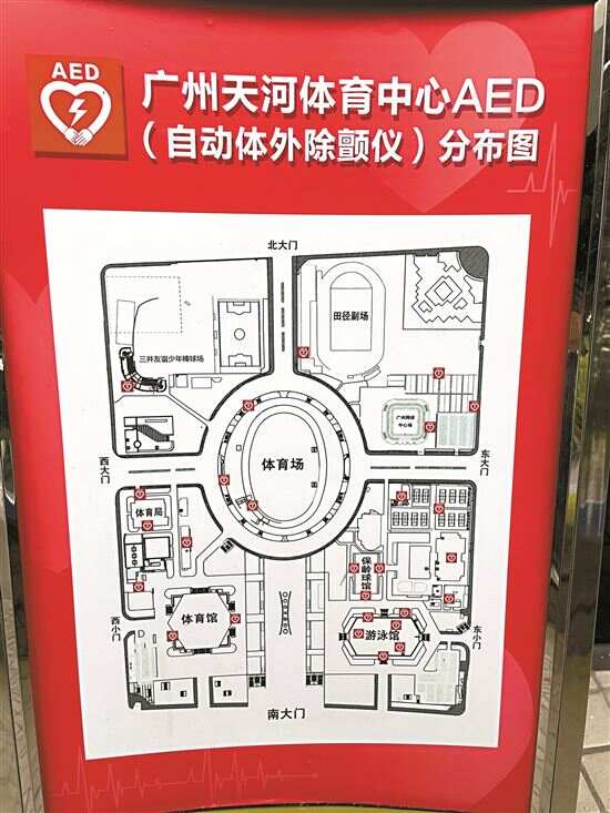 广州越来越多公共场所配备AED,然而,很多市民不清楚使用流程,相应指引标识普遍缺乏,统一的AED地图亟待上线…… 《广州市公共场所自动体外除颤器(AED)配置规范(暂行)》(《征求意见稿》)(以下简称《征求意见稿》),除规定公共场所AED配置的总则外,还对公共场所进行了分类,提出不同的公共场所需要配置的AED数量,对AED的标志标识、管理要求等作了细致规范。 近日,新快报记者走访了广州市内多处大型交通设施、体育场馆、大型商场、学校及养老机构等,通过实地走访发现,广州市内多个公共场所已新增AED,但仍有较多的场所缺乏充足指引或没有相关标识,紧急情况下难以快速找到AED;电子地图软件显示的部分AED定位存在错误或更新滞后。此外,在走访过程中,很多市民表示不清楚AED设备的使用流程,急需普及急救知识,学习、提升急救能力。 PART1 记者走访 ●点赞给力型 @学校 配置数量多 有高校部署点达32处 近日,新快报记者分别走访了华南师范大学大学城校区、暨南大学石牌校区、广州大学桂花岗校区、广州大学附属中学大学城校区、广州开元学校等。 在华南师范大学大学城校区,新快报记者发现AED除设置在师生密集的教学楼出入口处外,还分布在该校南区风雨球场舞台侧、田径场的南门、体育科学学院2楼大厅、体育馆4号门门口等主要运动场所的出入口或显眼处。但走访时记者未见学生居住的生活区有AED,该校学生常同学也向记者表示:“没有在宿舍区见过AED。” 在暨南大学教学楼、社区医院、体育馆,广州大学桂花岗校区图书馆、交流中心,记者均见到了AED,这些AED安装在人流密集的地方,位置显眼、易于发现、方便取用,且在不影响人员安全疏散的固定位置。AED外盒显示,大部分的AED来自于公益基金的捐赠。另据暨大官方发布的消息,截至今年6月,暨大石牌校区AED部署点共32处。 除了大学外,广州也有不少中学配备了AED。位于黄埔区的广州开元学校是一所区属公办学校。学校校医室负责人李梦娜告诉记者,校内4台AED均用立式柜存放,立式柜内还配备有急救箱、简易呼吸囊以及氧气瓶。校内AED有2台是使用学校经费购买,另外2台是使用广州市教育局教育装备专款采购。广大附中副校长席长华亦告诉记者,目前大学城校区配置了6台AED,分布在宿舍楼、医务室、体育馆等处,一部分由学校购买,一部分由社会捐赠。 @体育场馆 市属体育场馆 百余台设备投放到位 记者了解到,广州市体育局于2021年启动市属公共体育场馆AED的配置工作。目前,广州天河体育中心、广州市群众体育指导中心、越秀游泳场、矿泉游泳场、沙面体育俱乐部、海角红楼游泳场等市属体育场馆的100多台AED已投放到位,均设置在场馆醒目位置。 根据去年10月的数据,经过自行购买和外界捐赠,广州市市属体育场馆的“救命神器”配置总数量达到161台。 近日,新快报记者在天河体育中心(见下图)走访时看到,现场多个位置都设有AED设备的标识图,只要根据这一地图,可以很快找到AED设备。据记者统计,地图上标有AED标识的位置就有27个。 @养老机构 配备齐全 有定期巡检和日常维护 9月19日,新快报记者来到南沙区大岗镇敬老院。在敬老院一楼的老年人集中活动场所,进门的左手边就放置了一台AED,存放AED的箱子没有上锁,只要一打开箱子,保护箱就会发出警报声。存放AED的箱子高1.4-1.5米,无视线遮挡。在敬老院的各处,均张贴着引导指示牌,指引院内工作人员找到指定位置处的AED。敬老院院长何燕萍介绍,这是目前院内唯一一台AED,在今年5月份由大岗镇政府出资分配给敬老院。目前该敬老院有16位工作人员持有急救证。 该敬老院的工作人员向记者出示了该院AED的日常维护记录表和AED巡检表,每日该院会检查AED的电池是否正常,“AED右上角有指示灯,绿色常闪就表示正常,红色常闪就表示AED没电或出现异常。”该工作人员提到,一般情况下,每隔半个月或一个月,就会检查AED的放电是否正常。在AED巡检表中,记者看到有记录巡检的日期、电极片有效时间、电池时间、设备完整性等内容。 在广州市老人院,记者走访了该院的多栋建筑物,发现均有AED放置在进入大门的位置。该院的慈云楼进门的右手处就放置着一台AED。该品牌的AED在存放箱体最下方分四个步骤用中英文介绍了该款AED的使用方法。广州市老人院康复部负责人朱国栋介绍,目前该院有6台AED,2019年时由民生银行捐赠了3台,随后老人院又自行购买了3台,基本上院区每一栋楼均有配置。 ●尚待改善型 @大型商场 走访四家商场 两家未见配备 近日,新快报记者先后走访了位于天河区的正佳广场、天河城以及番禺万达广场、番禺天河城四个商场。四个商场中,番禺万达广场、番禺天河城均未配置AED设备,正佳广场、天河城商场一楼的游客中心(咨询台)各放置了一台AED。但两个商场的导览图中均无标注AED的具体位置。其中,天河城一楼咨询台处的AED相对显眼且好找,正佳广场的AED放置位置较低,有导游台的遮挡存在视线障碍,过往市民从远处一时很难看到AED。 在番禺万达广场,记者在该商场导引图中没有看到标明AED设备的相关标识,在记者将番禺万达广场4层楼走遍后,均未发现AED的“踪迹”。番禺天河城与上述情况相同,在一楼的客户服务中心,记者向工作人员询问后对方表示,商场5楼设置了一台AED,至今还没有使用过,但会定期维护。“我们有组织人员