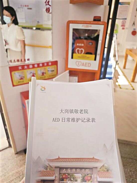 ■南沙区大岗镇敬老院工作人员向记者展示AED日常维护记录表。 |