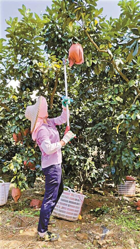 新快报讯 记者赖妍 通讯员黄国锋报道 临近中秋,梅州市五华县长布镇梅塘村金柚种植示范基地内,数百亩的山坡种满蜜柚树,金黄的蜜柚挂满枝头,微风徐来,清香四溢。当地脱贫务农群众穿梭其中,忙着采摘蜜柚。 示范基地负责人向新快报记者介绍,得益于有机种植、科学管护,今年的蜜柚品质更上一层楼,收购价格也比去年上涨了不少,品质上佳的蜜柚收购价达到了5元/斤。蜜柚还未成熟开摘,就有不少客户提前预订,目前收到的订单有10多万斤。 今年以来,五华县长布镇充分利用资源环境优势,因地制宜发展特色产业,不断优化发展布局,全力建设宜居宜业和美乡村,推动乡村振兴迈出坚实步伐。广州番禺区驻梅州市五华县长布镇帮镇扶村工作队(下称“工作队”)通过扩大种植面积、提升品质及拓展销售等环节,使蜜柚成为梅塘村增加就业、稳定增收的主渠道。在工作队的支持下,示范基地蜜柚种植面积由原来的100亩增至200亩,工作队还联系科技特派员团队对果树进行优化,提升蜜柚品质,同时进行病虫害防治,预计示范基地今年产量达20万斤,产值达80万元。 与此同时,工作队还积极联系后方单位,大力开展消费帮扶,今年销售蜜柚近万斤,极大地提高了梅塘村种植户的积极性。在示范基地务工的当地村民也表示,有了这个基地,他每天可以赚到200元,“在家门口实现就业增收,蜜柚真正成为了我们村民的‘甜蜜’产业。”