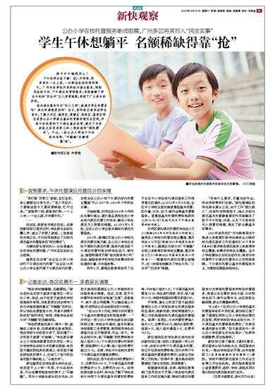 公办小学在校托管服务渐成刚需,广州多区将其列入“民生实事” 孩子中午睡得好么?下午放学后在干嘛?进入开学季,很多家长一边上班,一边牵挂在校托管的孩子。广州市各学校开展的校内课后服务,特别是