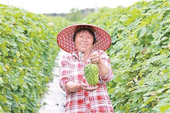 ■长期在福绿康家庭农场务工的妇女在苦瓜绿叶间采摘果实。 |
