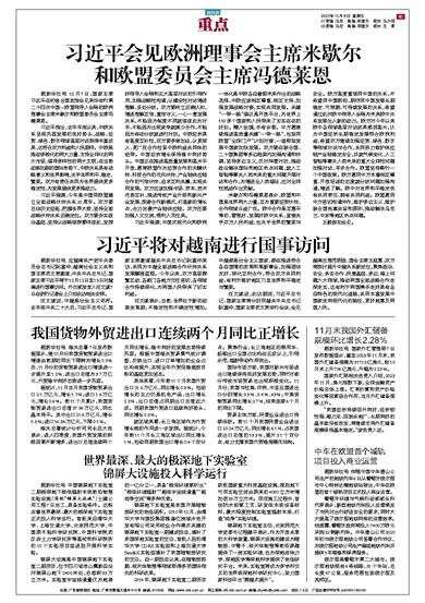 据新华社电 12月7日,国家主席习近平在钓鱼台国宾馆会见来华举行第二十四次中国-欧盟领导人会晤的欧洲理事会主席米歇尔和欧盟委员会主席冯德莱恩。 习近平指出,去年年底以来,中欧关系呈现巩固发