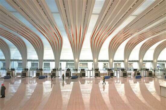 候车大厅两端的木棉花红与象征“云山珠水”的折板造型吊顶东西贯通,蕴含百舸争流的广东龙舟文化。 |