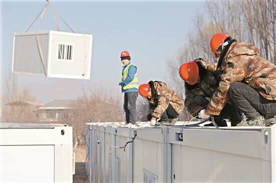 ■12月24日,在积石山县刘集乡陶家村一集中安置点,施工人员给活动板房接通电源。 |