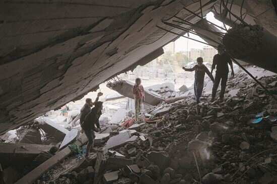 ■12月23日,在加沙地带南部城市汗尤尼斯,人们查看以军空袭后的废墟。 新华社发 |
