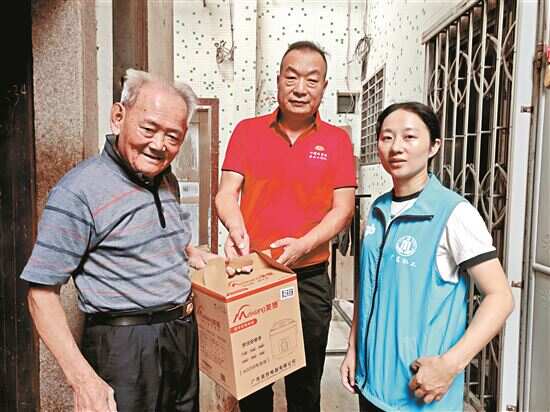 ■魏庆(中)把电饭锅送到有需要的老人手上。 |