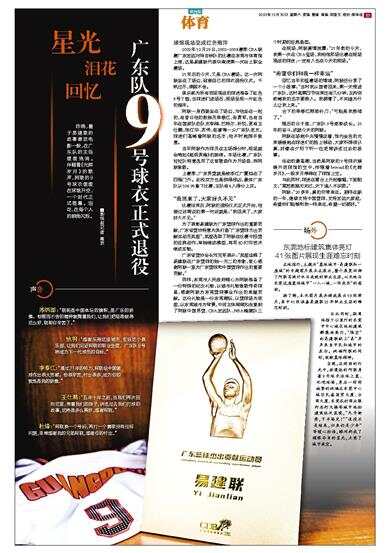 昨晚,属于易建联的故事像放电影一般,在广东队的主场缓缓流淌。伴随着《光辉岁月》的歌声,阿联的9号球衣缓缓在球馆升空,一个时代正式落幕。泪花,在每个人的眼角闪烁。 球馆现场变成红色海洋 2002年12月29日,2002-2003赛季CBA联赛广东宏远对阵吉林队的比赛在东莞市体育馆上演,这是易建联代表华南虎第一次站上职业赛场。 21年后的今天,又是CBA赛场。这一次阿联坐在了场边,迎接自己的球衣退役仪式。千帆过尽,满眼不舍。 俱乐部为所有到场观战的球迷准备了红色9号T恤,当球迷们进场后,现场呈现一片红色的海洋。 阿联一身西装坐在了场边,与他坐在一起的,有昔日他的教练员李春江、张勇军,也有当年在国家队的队友李楠、巴特尔、孙悦,更有王仕鹏、陈江华、苏伟、赵睿等一众广东队老友。球迷们高喊着阿联的名字,他不时地挥手致意。 当年阿联作为球员在主场得分时,现场就会响起《超级英雄》的旋律。本场比赛,广东队拉拉队特意选用了这首歌曲作为开场曲,向阿联致敬。 上赛季,广东男篮就是被浙江广厦挡在了四强门外。此役双方也是拼得很凶,最终广东队以106:95拿下比赛,主队有6人得分上双。 “我回来了,大家好久不见” 比赛结束后,阿联的退役仪式正式开始,他接过话筒说的第一句话就是:“我回来了,大家好久不见。” 为了表彰易建联为广东篮球作出的重要贡献,广东省篮协特意为其打造“广东篮球杰出贡献运动员奖座”,奖座选取了阿联在比赛中投篮的经典动作,单独做成模型,再用3D打印技术做成实物。 广东省篮协会长刘克军表示:“奖座诠释了易建联在广东篮球的独一无二的形象,衷心感谢阿联一直为广东篮球和中国篮球作出的重要贡献。” 同样,东莞市人民政府精心为阿联准备了一份特殊的纪念礼物,以城市礼物致敬传奇球星,感谢阿联为东莞篮球事业作出的卓越贡献。这份礼物是一份东莞潮玩,以篮球场为底座,以东莞城市为背景,中间主体栩栩如生复刻了阿联中国男篮、CBA宏远队、NBA雄鹿队三个时期的经典造型。 在现场,阿联真情流露:“21年前的今天,我第一次在CBA登场,我相信那场比赛在现场观战的球迷,一定有人也在今天的现场。” “希望你们和我一样幸运” 回忆当年初登赛场的情境,阿联还分享了一个小故事:“当时我从国青回来,第一天便进广东队,这时离第四节结束还有几分钟,主帅突然喊我的名字要换人。我都懵了,不知道为什么让我上来。” 台下的李春江顺势补刀:“可能是我换错了。” 随后的日子里,广东队9号逐渐成长。21年的奋斗,成就今天的阿联。 阿联在场地中央慢慢说着,馆内金色的光束缓缓地在球迷们的脸上移动,大家听得很认真,好像在夕阳下听一位老将讲述过去的故事。 活动的最高潮,当然是阿联的9号球衣缓缓升到球馆的空中,伴随着beyond的《光辉岁月》,一段岁月停滞在了球馆上空。 与此同时,球迷在看台上升起横幅,下面配文:“莫愁前路无知己,天下谁人不识君。” 阿联:“20多年,真的非常幸运。期待在新的一年,继续支持中国篮球,支持宏远大家庭,希望你们能够和我一样幸运,希望一切都好。” 场外 东莞地标建筑集体亮灯 41张图片展现生涯难忘时刻 在球馆外,主题为“篮球城市·易建联和一座城”的专题图片展正在展出,整个展览回溯了阿联写满汗水与成就的职业生涯,以及他与东莞这座篮球城市“一人一城、一同成长”的感动。 据了解,本次图片展共精选展出59张照片,其中41张涵盖易建联21年职业生涯的难忘时刻。 与此同时,距离球馆十公里外的东莞市中心城区地标建筑群集体亮灯,“隔空”向易建联献上“易”声声来自市民和城市的表白。祝福阿联的同时,致敬篮球精神。 当晚,在绚丽的灯光中,动漫版的阿联身着9号球衣运球上篮、叱咤球场,身后一则则诚挚的祝福在东莞中心城区民盈国贸大厦、台商大厦、东莞农村商业银行总行大楼等城市地标建筑依次显现,“九号新秀,下半场见!”“退役不是结束,归来仍是少年”等暖心标语,瞬间构成了耀眼夺目的星光,点亮了城市夜空。 声音 苏炳添:“联哥是中国体坛的旗帜,是广东的骄傲。他锲而不舍的精神鼓舞着我们,让我们把短跑做得这么好,联哥你辛苦了。” 姚明:“感谢东莞这座城市,宏远这个俱乐部,让我们见证阿联的职业生涯。广东队9号将成为下一代球员的目标。” 李春江:“通过21年的努力,阿联给中国篮球作出很大贡献。他很辛苦,付出很多,成为你的教练是我的骄傲。” 王仕鹏:“五年十年之后,当我们再次回归这里,带着我们的孩子,讲述过去我们打球的故事,这将是多么美好,感谢阿联。” 杜锋:“阿联换一个号码,再打一个赛季没有任何问题,非常感谢我的兄弟阿联,感谢你的付出。” ■新快报记者 高京