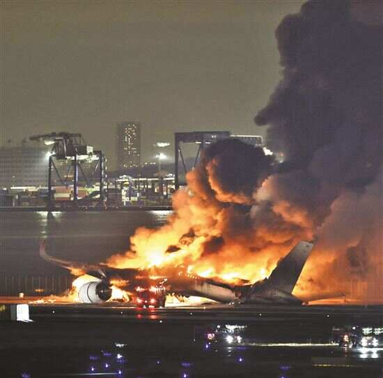 ■2日,日本航空一架A350客机在东京羽田机场与一架海上保安厅飞机发生碰撞,致5死一伤。另外,日本石川县能登半岛1日发生的7.6级地震造成死亡人数已升至55人。VCG图