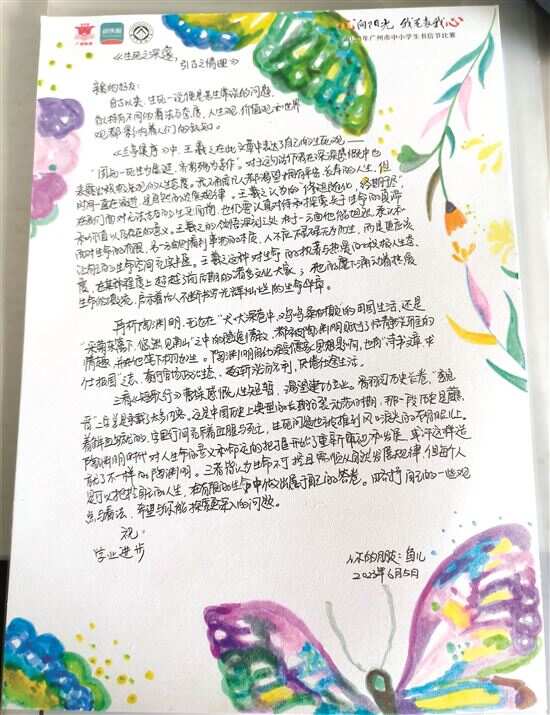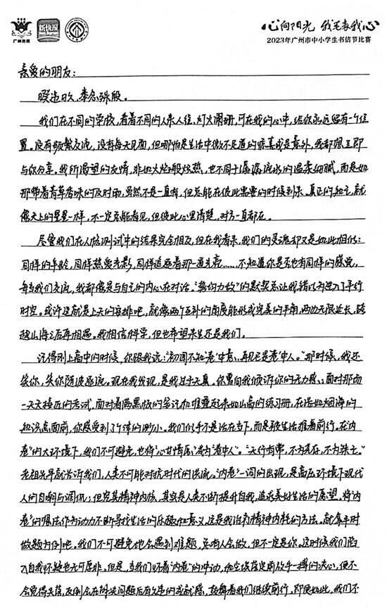 2023年广州市中小学生书信节比赛优秀作品鉴析⑤ “红日初升,其道大光”,少年强则国强,少年进步则国进步,千百年来,青春的力量,青春的涌动,青春的创造,始终是推动中华民族勇毅前行、屹立于世界民族之林的磅礴力量。在本次由广州市教育局主办,共青团广州市教育局委员会、广东新快报社和广州市艺术中学联合承办的“心向阳光·我笔表我心——2023年广州市中小学生书信节比赛”获奖作品中,我们捕捉到了广州少年们的闪光思想,或许是对现实问题的思考,或许是乐观情感的抒发,亦或者是对自我身份的认同感……这些深刻的思考都浓缩在一张张信纸上,成为青少年时期珍贵的留念,为学子们未来的人生打下基础。 勇敢无悔地追逐梦想 作者 关卉昕 “究其精神内核,‘卷’其实是人类不断提升自我、追求美好的愿望” 来自广州市第二中学的关卉昕同学以作品《朱明寄愿》获得了本次书信节比赛高中组一等奖。这是一封写给好友的信件,信中除了表达对志同道合好友深切的思念,作者还与好友分享了自己对于“内卷”现象的思考。她写道:“对于17岁的少年而言,应是勇敢而无悔地追逐自己的梦想。”她热烈地向友人发出邀请,“与其纠结不可预见的将来,我们不如迈开步子,大步向前。” 作为学业繁忙的高中学生,关卉昕留意到一个字经常挂在同学们嘴边,那就是“卷”。当自己在刷题或是挑灯夜战时,有些同学会开玩笑般调侃一句:“你好卷呀!”“你真是个卷王。”何为“卷”?关卉昕认为,这是“内卷”的意思,这个词的出现是高压环境下现代人的自嘲与调侃。每个人对“内卷”的理解和情感色彩不尽相同,在网络上搜索相关词条时,出现的也多是负面情绪,但卉昕观察到了其中积极的一面。“究其精神内核,‘卷’其实是人类不断提升自我、追求美好的愿望,我们不应该过于‘放大’他人表面的行为,而忽略他人内心向好的主观能动性。”在她看来,大家对“卷”的理解太过于笼统,正如在看到一名同学埋头“刷题”时,除了追求分数的提升外,我们更应该看到他(她)学习的激情和自律,而不要让“内卷”这个词轻易抹杀他人付出的努力。 指导老师 施一虹 书信让思绪放飞得更远 “卉昕是个内敛而又内心细腻的孩子,这次书信比赛给了她一个用擅长的方式表达自己的平台。”在指导老师施一虹的印象中,卉昕的每一次阅读札记都写得很认真,在语文课前的时事分享环节,她曾提出过独到的见解。 在这篇书信作品中,施一虹认为没有矫揉造作,也没有空洞的教化,而是处处流淌着真情实感,“她指出了自己和小伙伴在这个年龄段真实的困惑,字里行间有属于她自己的亲身体验,可能她对这个问题确实思考已久,最终有感而发,才让这篇作文如此令人动容。”施一虹点评道。在面对“内卷”困境时,关同学没有回避,没有恐慌,更加没有激愤地去批判“内卷”现象,而是在社会上没有出现一个“解决之道”的时候主动调整自己看待这一问题的心态,这是施一虹老师较为欣赏的一点。“其实我觉得二中的学生整体上就是积极向上、真诚善良,这是许许多多二中学生的缩影。” 施一虹认为,“书信”这种写作方式自带交流的情境,正如关卉昕同学的这篇作品,在与友人的交流中引发自己的思考。同时,书信写作是一种“慢节奏”,有助于让作者内心的想法变得更清晰,让思绪放飞得更远,她鼓励同学们多尝试写信,“或许写着写着,自己此前从未预期的东西会跃然纸上”。 写信是一种情绪的释放 作者 余力文 “优秀传统文化能给我们带来正向的能量,让我们更加从容地面对生活中的困难” “‘固知一死生为虚诞,齐彭殇为妄作’。对于这句话,作者在深深感慨中也表露出积极乐观的人生态度……”广州市艺术中学余力文同学的《生死之深邃,引古之情理》在此次书信节比赛中获得了高中组一等奖。信中,他以王羲之、陶渊明和曹操等古代大家的作品为例,与好友分享和探讨生命的意义,字里行间透出对于生命的思考及积极的人生观。 余力文出生在书香世家,从小耳濡目染,对于书法、古代文学等传统文化尤为喜欢。在学习和成长过程中,他也深深体会到优秀传统文化给自己带来的积极影响,也从很多古代文学大家的故事中汲取到了精神动力,“比如他们的淡泊名利,面对坎坷命运时的乐观态度,都能给我们带来正向的能量,让我们更加从容地面对生活中的困难。”余力文称,信中选择跟朋友分享关于“生死”的思考,是有感于一些同龄人对于生活的态度,希望和朋友共勉,“人的生命只有一次,那么我们应该去思考如何让自己的人生活出价值和精彩。” 写信已经成了余力文的一种生活习惯。“在我看来,写信是一种情绪的释放,会让我感觉到舒心,我把想要分享的东西写下来,朋友们无论回不回信或是以其他的方式回应,我都会觉得开心。”余力文认为,书信是一种有温度的交流方式,“可能它没有现代通讯那么方便快捷,但那种珍视的感觉和在读信过程中感情距离的拉近,我觉得是其他交流方式暂时没法替代的。” 指导老师 方菡 书信节比赛让学生感受到 “见字如面”的力量 “从文章中,我们可以感受到余力文同学对‘生死’这一话题的思考,更能感受到他‘在有限的生命中做出属于自己的答卷’的积极态度。”对余力文的作品,广州市艺术中学老师方菡颇为欣赏。方菡说,以