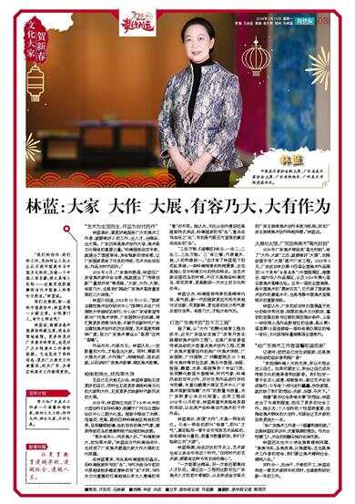 “我们的创作、我们的工作,是如何让人民大众认识到中国美术与中国文化的好,为做一个中国人而自豪,使之具有人民性——这就是我所理解的当代中国画人的责任与担当。”林蓝说。 我们注意到,新一届的中国美协中,林蓝是唯一女副主席。女性掌门人,有什么特点呢? 林蓝说:能够当选中国美协的副主席,我也非常地珍惜。更多的是对广东美术的肯定,也是对广大女性美术工作者的鼓励。它也坚定了我的信念:要为广大美术工作者服务,把为广东、为湾区的美术工作做得更好。 “艺术为生活而生,作品为时代而作” 林蓝表示,要更好地服务广大的美术工作者,就要做好人的工作,出人才,出精品,出大展。广东历来是美术创作大省,美术是文化强省的重要力量。“岭南画派在百年前,就提出了国画革命,其命惟新的使命感,让广东画家具有了优良的传统:艺术为生活而生,作品为时代而作。” 2022年6月,广东美协换届,林蓝任广东省美术家协会主席,她就提出了“传承创新”“量质并举”等思路,“大家、大作、大展,有容乃大,这是我们推动广东美术高质量发展的三大举措。” 林蓝介绍道,2023年10月10日,“国家主题性美术创作研究中心”授牌仪式在广州美院大学城校区举行,中心由广东省委宣传部与广州美术学院、广东画院分别共建,将汇聚更多资源与优势,不断开拓新时代广东主题性美术创作的历史深度、艺术高度和精神广度,助力广东美术事业从“高原”迈向“高峰”。 作品为先,内容为王。林蓝认为,一定数量的大作,才能垒出大家。同时,需要用大展为大家、大作推广,相辅相成,彼此成就,从而讲好广东美术故事、湾区美术故事。 岭南乾坤大,犹怜草木深 见自己见天地见众生,林蓝希望能见到更好的自己,同时也见到更多表现岭南文化的大家和大作,见到更多反映新时代新风采的大展。 2023年,林蓝独立完成了9.6米×6米的大型创作《吉祥岭南》,现藏于广州白云国际会议中心二期大礼堂。画面中描绘了木棉、鸡蛋花、芭蕉、荔枝四种岭南地区特有的花果,呈现馥郁斑斓、生机勃勃的南方气象,兼具传统花鸟的意趣和现代绘画的构成感。 “草木有本心,何求美人折。”“岭南乾坤大,犹怜草木深。”林蓝在古代岭南诗词中,也找到了广东美术塑造大家大作大展的文化底蕴。 在林蓝看来,写生是岭南画派的基石。而岭南画家所写的“生”,与作为政治中枢的中原地域较多概述意味的写“实”不同,与作为文化重镇的江南地域众多文人意绪的写“意”亦不同。她认为,无论从创作意识还是画面样式来说,岭南画家的写“生”,重点在写生活之“生”,写的是可眼见可直观的真正活生生的“生”。 “三生万物,《道德经》有云,一生二,二生三,三生万物。‘三’有三横,代表着天、地、人的和谐统一。”这才有了林蓝笔下的花红果绿,一派岭南闹春的热闹景象,这也是她心目中岭南文化的民俗特点。当艺术家在画花鸟的时候,不仅只是描绘岭南花鸟、奇花异草,更是歌颂一方水土的文化和生命。 林蓝认为,岭南画派传承的是精神内核,是气质;新一代的画家更应无拘无束地守正创新,用更新鲜、更包容的活力和气象去面对世界。有容乃大,才能大有作为。 打造广东美术的“百千万工程” 据了解,以“大作”的孵化培育工程为抓手,近年广东组织实施了“改革开放实践题材美术创作工程”。这是广东省委宣传部启动的大型重点美术创作工程,汇聚广东美术重要创作机构广州美术学院、广东画院、广州画院、广州雕塑院及21个地级市美协等百位名家,集合中国画、油画、版画、雕塑、水彩、漆画等多个专业门类,共同孵化彰显中国精神、时代气象、岭南风韵的百件力作,并对优秀作品进行评估与收藏,丰富白鹅潭大湾区艺术中心广东美术馆新馆馆藏“大作”的数量与质量,为广东积累公共文化财富。这项工程在2023年12月收官,林蓝希望未来能有多期的滚动,以此来产生岭南当代美术的千件作品。 林蓝表示,所谓“大作”,不是一两张而已。只有一两张的那叫“惊喜”,那叫“才气”,真正能用一辈子去书写其艺术品格的,张张都有分量的,质量与数量积淀,我们才能称之为“大家”。 林蓝强调,站在历史的节点上,艺术家也有义务去书写这个时代,“任何时代的艺术家,都要有这种书写史诗的雄心”。 “一方面要出精品,另一方面还要集结人才队伍。通过这一工程捋出数百位广东美术人才的老中青梯队,以此形成金字塔式的广东主旋律美术创作系统与机制,夯实广东主旋律美术创作阵地阵营。”林蓝说。 大展与大馆:广东迎来美术“高光时刻” 2024年广东美术将迎来“高光时刻”:有了“大作、大家”之后,就要做好“大展”,如推动国字号“大展”落户广东工程。2023年8月,广东成功申办第十四届全国美术作品展览(以下简称“全国美展”)中国画展区,港澳台、海外华人作品展区,以及2024年第七届全国美术高峰论坛。五年一届的全国美展,是中国美术的“奥林匹克”,它代表了国家美术创作的最高水平,也是考察中国美术发展现状的重要指标。 林蓝认为,广东的成功申办国展基于充分的条件和优势:深厚的美术文化积淀、蓬勃的发展态势与过硬的展览展示条件,上届一举夺得入选作品数首位的佳绩,是从第1届至第13届连续每一届均有承办展区的唯一省份,文化场馆体量规模居全国前列。 “给广东