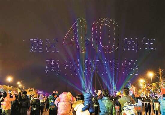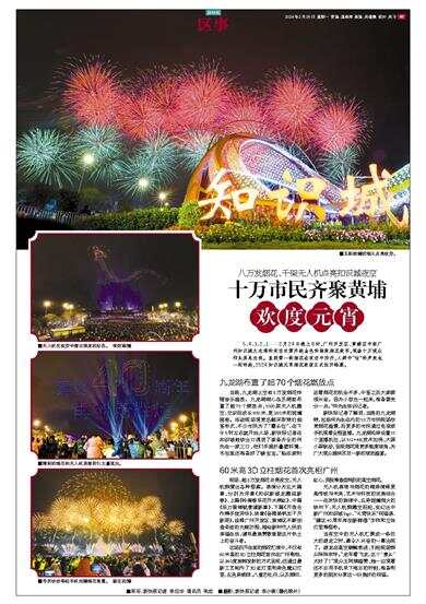 八万发烟花、千架无人机点亮知识城夜空 5、4、3、2、1……2月24日晚上8时,广州开发区、黄埔区中新广州知识城九龙湖的夜空次第升起金色的倒数烟花数字,现场十万观众仰头屏息注视。直到第一轮烟花在夜空中炸开,人群中“哇”的声浪也一同响起,2024知识城元宵烟花表演正式拉开帷幕。 九龙湖布置了超70个烟花燃放点 当晚,九龙湖上空有8万发烟花伴随音乐盛放。九龙湖湖心岛及湖面布置了超70个燃放点,1000架无人机腾空,交织而成长900米、宽280米的斑斓画卷。活动现场观赏名额采取预约抽签形式,不少市民为了“霸头位”,在下午5时左右就开始入场,新快报记者在知识城地铁出口遇到了装备齐全的何先生一家三口,他们手提折叠塑料凳,书包里还准备好了暖宝宝。“能在家附近看烟花的机会不多,中签之后大家都很兴奋。因为小孩也一起来,准备要充分一点。”何先生告诉记者。 新快报记者了解到,当晚的九龙湖畔,包括何先生在内的10万市民现场欣赏烟花盛景,而更多的市民通过电视或手机观看全程直播。九龙湖沿岸设置11个直播机位,以5G+4K技术加持,大屏小屏联动,呈现烟花观赏多维度视角,为广大观众提供耳目一新的视觉盛宴。 60米高3D立柱烟花首次亮相广州 现场,超8万发烟花点亮夜空,无人机群摆出各种图案。表演分为五大篇章,分别为序章《知识新城龙腾迎新春》、上篇《岭南春早花开木棉红》、中篇《活力黄埔锐意谱新章》、下篇《开放合作携手绽芳华》、终章《奋楫扬帆实干开新局》,诠释广州开发区、黄埔区不断创造奇迹的光辉历程,描绘新时代人民的幸福生活,谱写最美赞歌致敬这片热土上的奋斗者。 这场别开生面的烟花汇演中,不仅有60米高的3D立柱烟花首次在广州亮相,以360度旋转发射的方式呈现;还通过最新工艺制作了3D红灯笼和彩色魔幻灯笼、五色彩绣球、八重芯牡丹,以及脚印、红心、笑脸等造型特别的高空烟花。 无人机表演与烟花的精彩演绎更是传统与未来、艺术与科技的完美结合——在欢快的旋律中,五彩斑斓烟火的映衬下,无人机群腾空而起,变幻出中新广州知识城logo、“元宵快乐”祝福语、“建区40周年再创新辉煌”字样和立体灯笼等图形。 当夜空中的无人机汇聚成一条巨大的游龙之时,最令人兴奋的一幕出现了。游龙在高空蜿蜒前进,引起现场群众阵阵欢呼。“龙年看飞龙,这个‘意头’太好了!”观众王阿姨盛赞,她一边观看还不忘用手机录下难忘的时刻,准备和更多的朋友分享这一份美好的祝福。 ■采写:新快报记者 李应华 通讯员 张成 ■摄影:新快报记者 李小萌(署名除外)