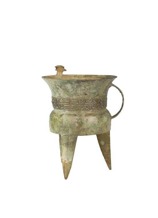■铜斝,商代(公元前1600-前1046年),1974年湖北省武汉市黄陂区盘龙城遗址李家嘴1号墓出土,湖北省博物馆藏。斝为盛酒器,也可温酒,商代盛行,多为王室和具有一定等级的贵族所用。“共饮一江水——长江流域青铜文明特展”展品,粤博供图。 |