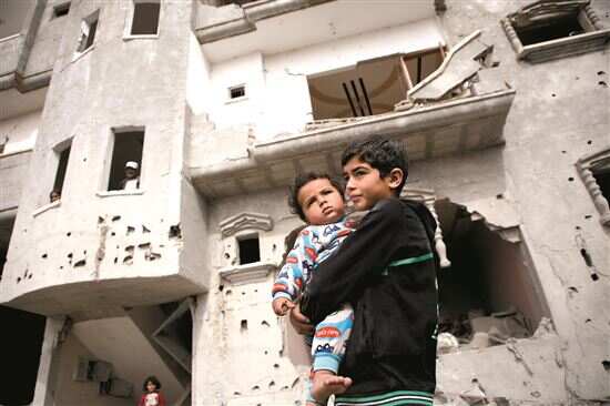 ■3月29日,在加沙地带南部城市拉法,儿童站在以军空袭后的废墟前。新华社发 |