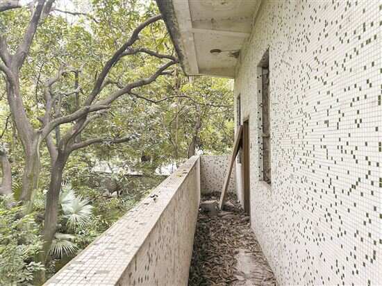 ■“别墅”如今被植物包围,荒废已久,走廊上布满落叶。 |