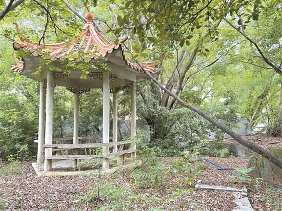 ■“别墅区”内有一栋小凉亭,亭外布满落叶。 |