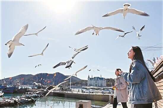 ■游人在大连老虎滩渔人码头看海鸟。 |