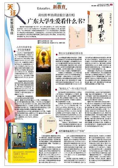 高校图书馆阅读报告话你知 高校图书馆里到底藏了多少书?当今大学生爱看什么书?谁是大学生最喜欢的作家?4月23日是“世界读书日”,华南师范大学、华南理工大学、南方医科大学、广州大学等多所广东高校近期陆续发布了“2023年度阅读报告”,用数据展示了学校师生年度阅读情况。记者梳理发现,人文社科类专业学生借书更多,《毛泽东选集》《平凡的世界》《明朝那些事儿》等作品备受大学生青睐。而作家东野圭吾的推理小说,男生女生都爱看。 人文社科类专业 学生借书最多 2023年,广东多所高校图书馆全年接待读者人次超过200万。广州大学图书馆2023年总入馆人次达288万,单日进馆人次最高值为2023年6月15日,达到14988人次。华南师范大学图书馆开馆365天,共接待读者244万人次,平均每天入馆6703人次。暨南大学图书馆和华南理工大学图书馆2023年进馆人数也达到了264.4万和200万人次。南方医科大学图书馆开馆350天,入馆总人次达120.8万。当日进馆人次最高值为2023年2月12日,达10067人次。 “每逢新学期伊始和各种资格考试的时候,都是进馆的高峰期。”惠州学院年度阅读报告显示,刚开学的3月份是进馆人次最多的月份,达110675人次。而在临近期末考试的12月,华师图书馆和广大图书馆的进馆人次都超过了30万。 借阅量方面,记者梳理发现,人文社科类专业学生的图书借阅量最多。暨南大学全年借书量达19.4万册,人均借阅量为12.8册,其中借书最多的院系是文学院。广州大学2023年流通图书借还共344521册,其中借书185012册。该校以学院为单位的人均借阅册次排名中,人文学院、马克思主义学院、数学与信息科学学院分别列前三名。而学院总借书册次排名则由人文学院、数学与信息科学学院以及管理学院占据前三位。 各高校图书馆2023年度上新的数据也十分可观。华南师范大学四校园图书馆共上新图书35万本,截至去年年底,纸质资源总量达4512479册。其中,文学类图书是上新最多的,共5万余本,占所有上新图书的15%。 男生女生都爱读东野圭吾 2023年哪些图书最受大学生欢迎?记者留意到,路遥的《平凡的世界》是多所高校图书借阅排行榜上的“常驻嘉宾”,在华南师范大学、汕头大学、肇庆学院图书馆中该书均位列第一。此外,《毛泽东选集》、刘慈欣的《三体》、余华的《活着》、当年明月的《明朝那些事儿》等亦深受学生喜爱。在华师月度图书榜上,《三体》成为2023年10月至12月连续三月借阅最多的图书。 华南理工大学数据显示,2023年图书查询年度热搜中,余华以688次的搜索次数登上排行榜第一,东野圭吾则以578次位列第二。华南师范大学年度最受欢迎作者前五分别为东野圭吾、鲁迅、余华、莫言和阿尔贝·加缪,东野圭吾的作品借阅次数达到了855次。汕头大学学生图书借阅排行榜(文史类)中,《平凡的世界》成为最受学生欢迎的图书,排行榜前十均为文学类图书。在南方医科大学、惠州学院人文社科类图书借阅排行榜中,文学类图书各占60%和70%。惠州学院文学类图书借阅次数达11620次,是第二名的历史、地理类图书借阅次数的五倍。文学类书籍在当代大学生中的受欢迎程度可见一斑。 阅读有偏好,男生和女生又分别爱读哪些书呢?华师阅读报告中,男女生最爱的图书和作者Top5榜单重合率高达80%。在男女生最爱的五本书中,《明朝那些事儿》《平凡的世界》《三体》《乡土中国》均名列其中。而在男女生最爱的五位作者中,高居榜首的是东野圭吾,鲁迅、余华、莫言等现当代作家也是华师学生借阅榜上的“明星”作者。 “泡馆达人”一年入馆2765次 每年高校图书馆的阅读报告中,阅读达人和“泡馆达人”的数据都令人大开眼界。暨南大学阅读之星中,博士生闫慧颖外借图书518册,博士生周昭根外借图书418册。华南师范大学本科生欧同学一年借阅543册图书,博士生杨帆借阅了332册。 各高校年度“泡馆达人”进馆次数大多高达上千次。从个人入馆次数上看,广州大学Top30本科生、研究生各占一半,在入馆次数前30位的读者中,法学院(律师学院)的研究生卢同学以2765次的入馆次数位居榜首,全年平均每天入馆超7次。南方医科大学药学院本科生陈同学和公共卫生学院研究生吴同学则以日均3.5次及日均9.7小时的泡馆时长成为南医大的“入馆达人”和“泡馆达人”。 “泡馆达人”是如何泡馆的?华南师范大学汕尾校区的夏青告诉记者,自己进图书馆主要是阅读文献、查找研究方向的资料信息,也会学习软件或阅读课外书籍。她说,图书馆就像是另一个“家”,也是心灵的港湾,“在图书馆比较容易获得内心的安宁与平静,很多阶段性的目标也是通过在图书馆日积月累的学习实现的。” 暨南大学文学院的硕士研究生田祺一年入馆2364次,荣登该校2023年度“泡馆达人”榜首。“没有课的情况下我都会选择去图书馆待着,除了阅读、查找毕业论文的资料,偶尔也会在空余的座位上休息一下。”田祺说,泡馆已成了自己的生活习惯,成为图书馆书虫志愿服务队队长后,和图书馆的感情愈加深厚。“图书馆是我在暨大学海航行中一个归港的地方。”田祺说,书虫志愿者除了维护图书馆阅读环境,也会参与到古籍数据化等工作中。“这个地方给了我很多的慰藉,我也希望为它做一些事情,比如经常检查馆内一些基础设施是否有损坏,如果有发现就会及时上报。” 高质量精准服务主打