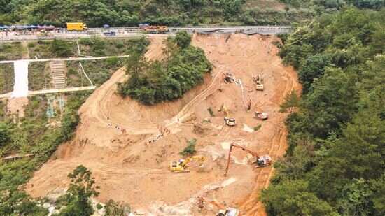 ■5月2日,救援力量在广东梅大高速茶阳路段塌方灾害现场作业。 新华社发
